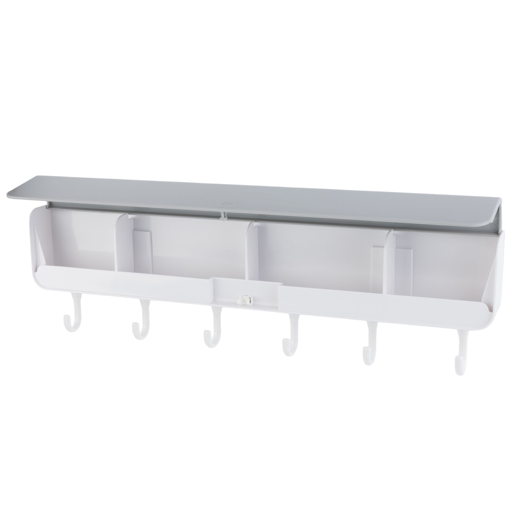Alles, was man beim Gang aus dem Haus noch brauchen könnte: Die multifunktionale Schlüsselleiste eignet sich, um Schlüssel, aber auch Regenschirme und anderes an der Tür in Griffweite zu haben. In der Ablagebox finden nützliche Utensilien wie Taschentücher und Sonnenbrillen ihren Platz. Beides lässt sich durch die Klebehaken befestigen, ohne Löcher in die Wand zu bohren.