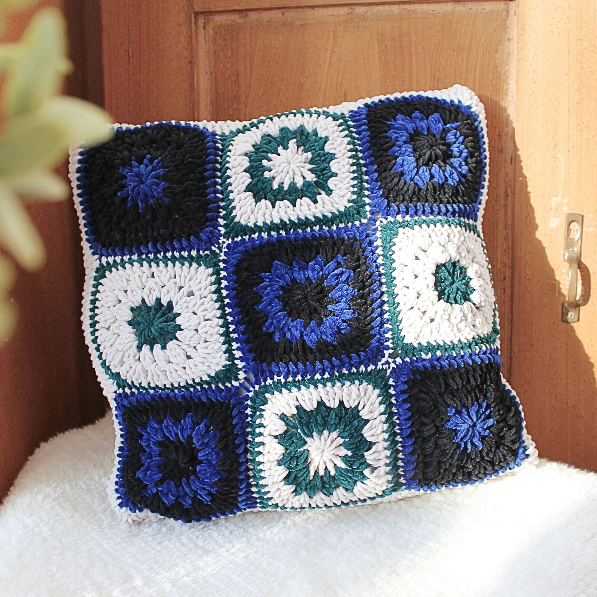 Das Set von myboshi umfasst Wolle, Häkelnadel und Wollnadeln zum Erstellen einer quadratischen Kissenhülle.
