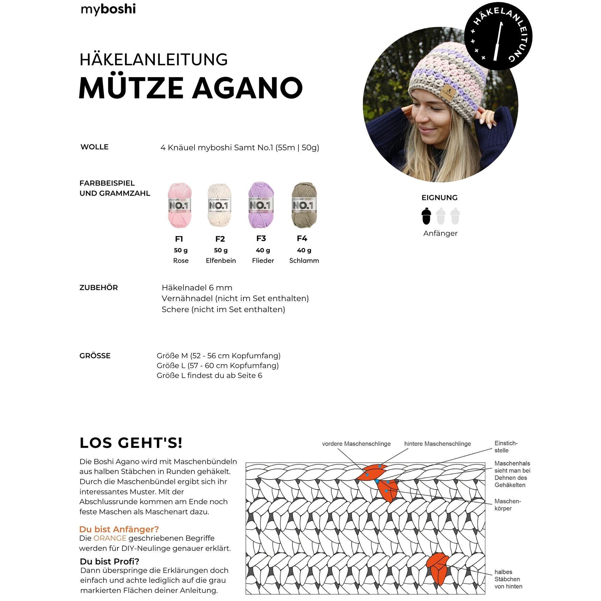 Musik an, Füße hoch und Häkel-Set hervorgeholt: Mit der Zusammenstellung von myboshi hast du alles zur Hand, was du brauchst, um ganz gemütlich eine charmante Kopfbedeckung für den Winter häkeln. Die Mütze Agano begeistert mit ihrem Streifendesign und einem raffinierten Maschenmuster. Ein Set für kreative Relaxstunden.