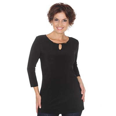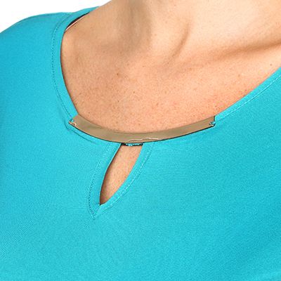 - Rundhalsausschnitt mit Tropfenschlitz und metallfarbene Zierspange