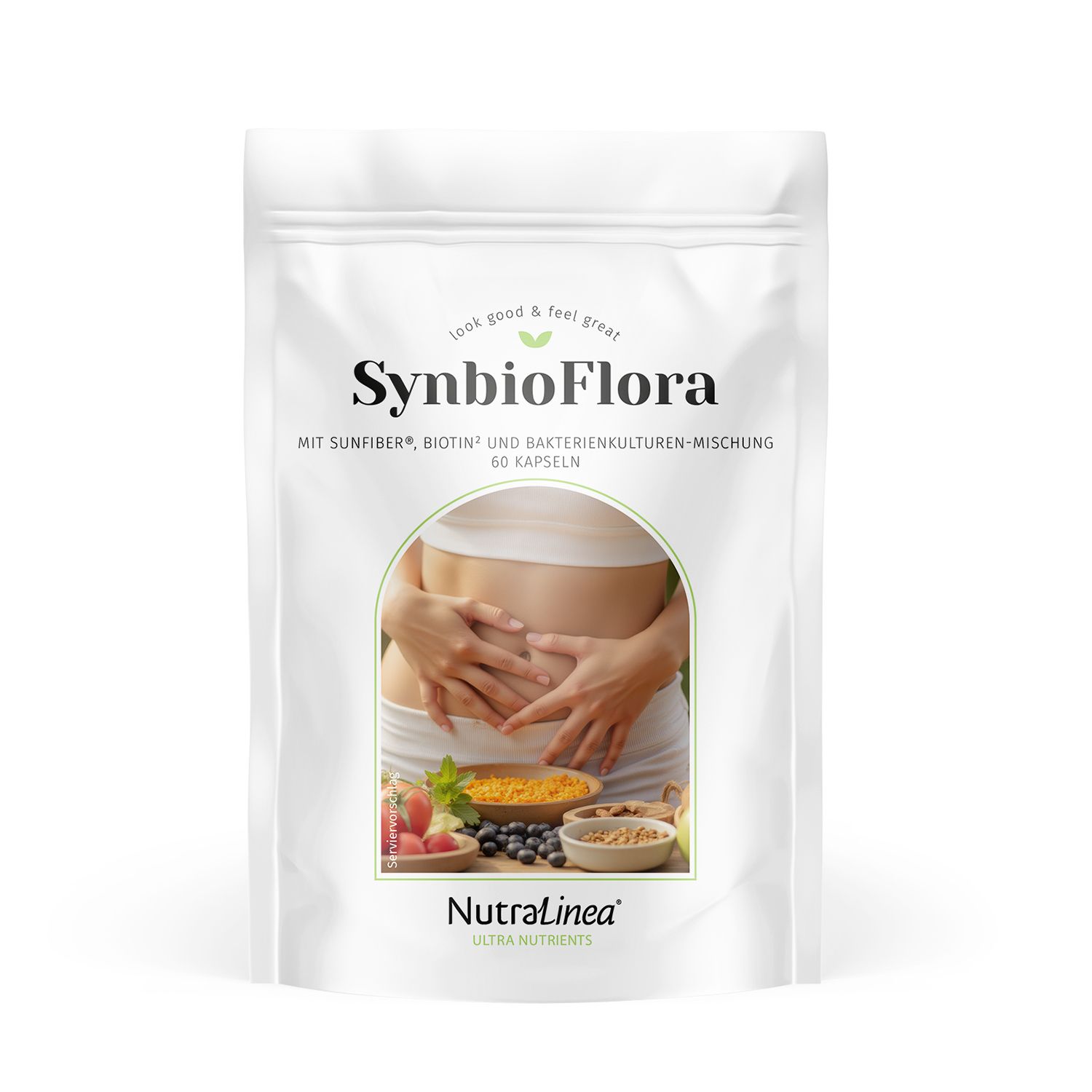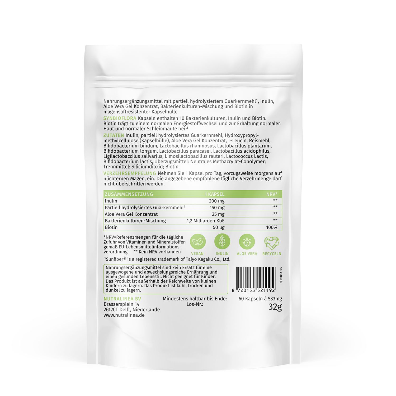 NutraLinea® Synbioflora ist ein Nahrungsergänzungsmittel mit partiell hydrolysiertem Guarkernmehl, Inulin, Aloe Vera Gel Konzentrat, Bakterienkulturen-Mischung und Biotin