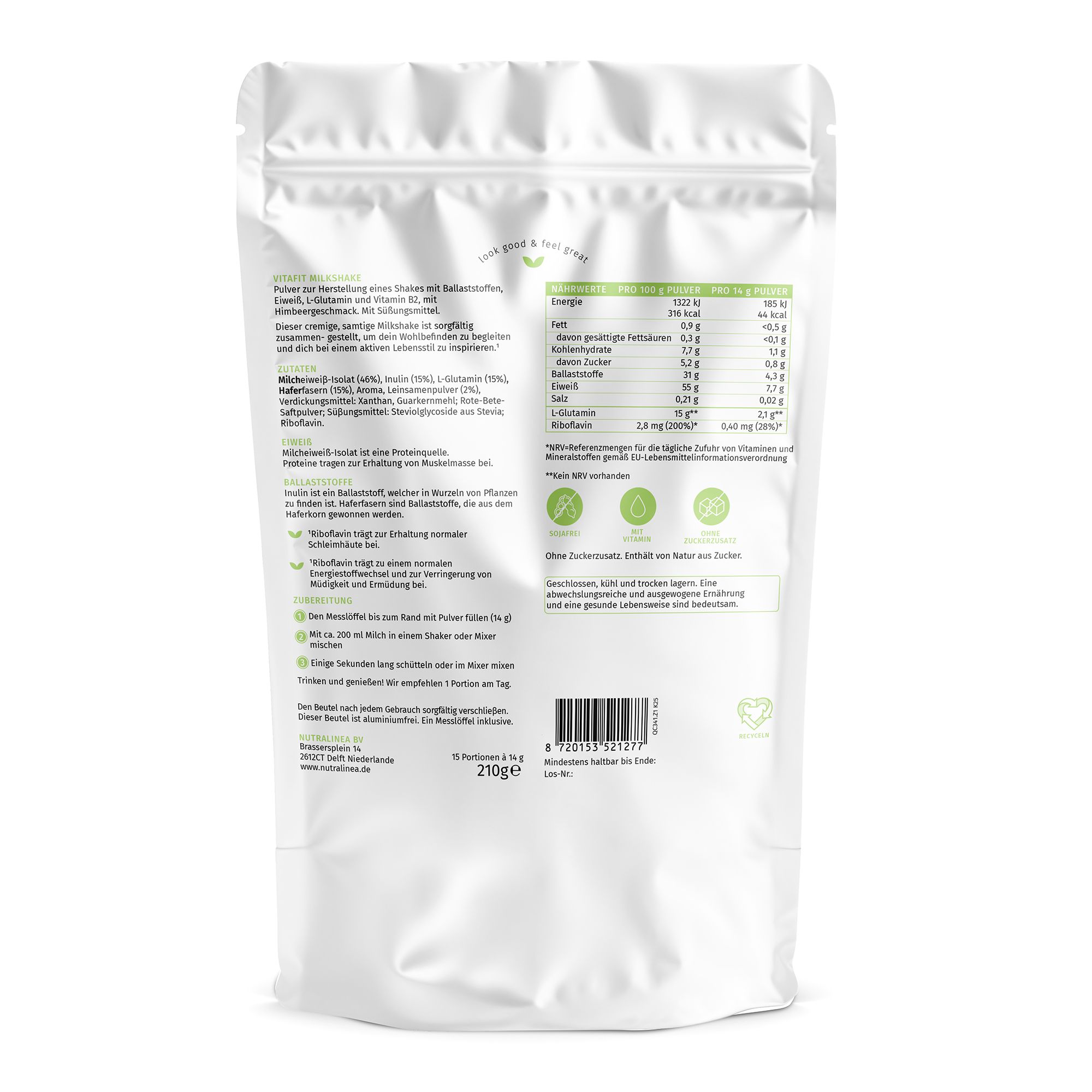 - Pulver zur Herstellung eines Shakes mit Ballaststoffen, Eiweiß, L-Glutamin und Vitamin B2