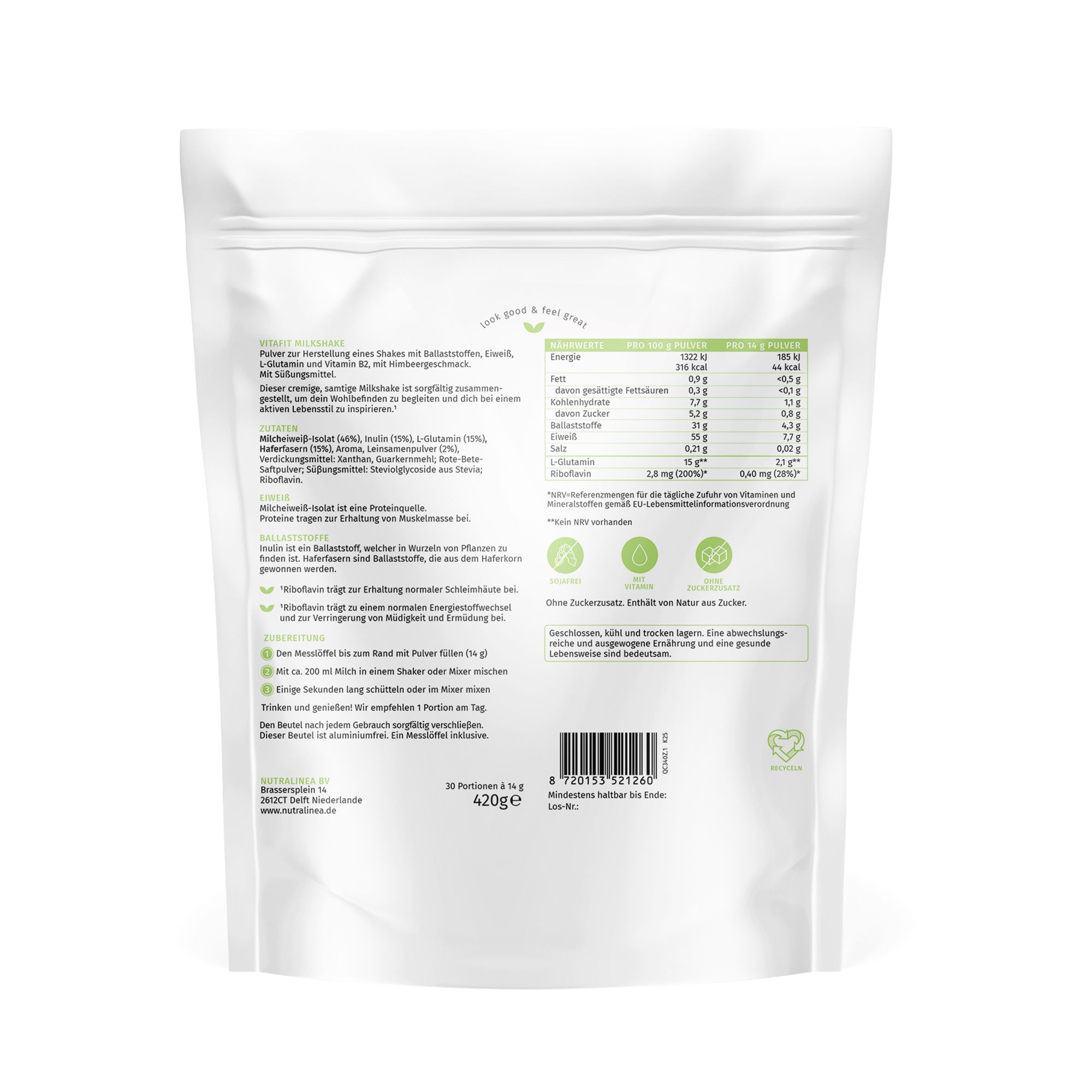 - Pulver zur Herstellung eines Shakes mit Ballaststoffen, Eiweiß, L-Glutamin und Vitamin B2
