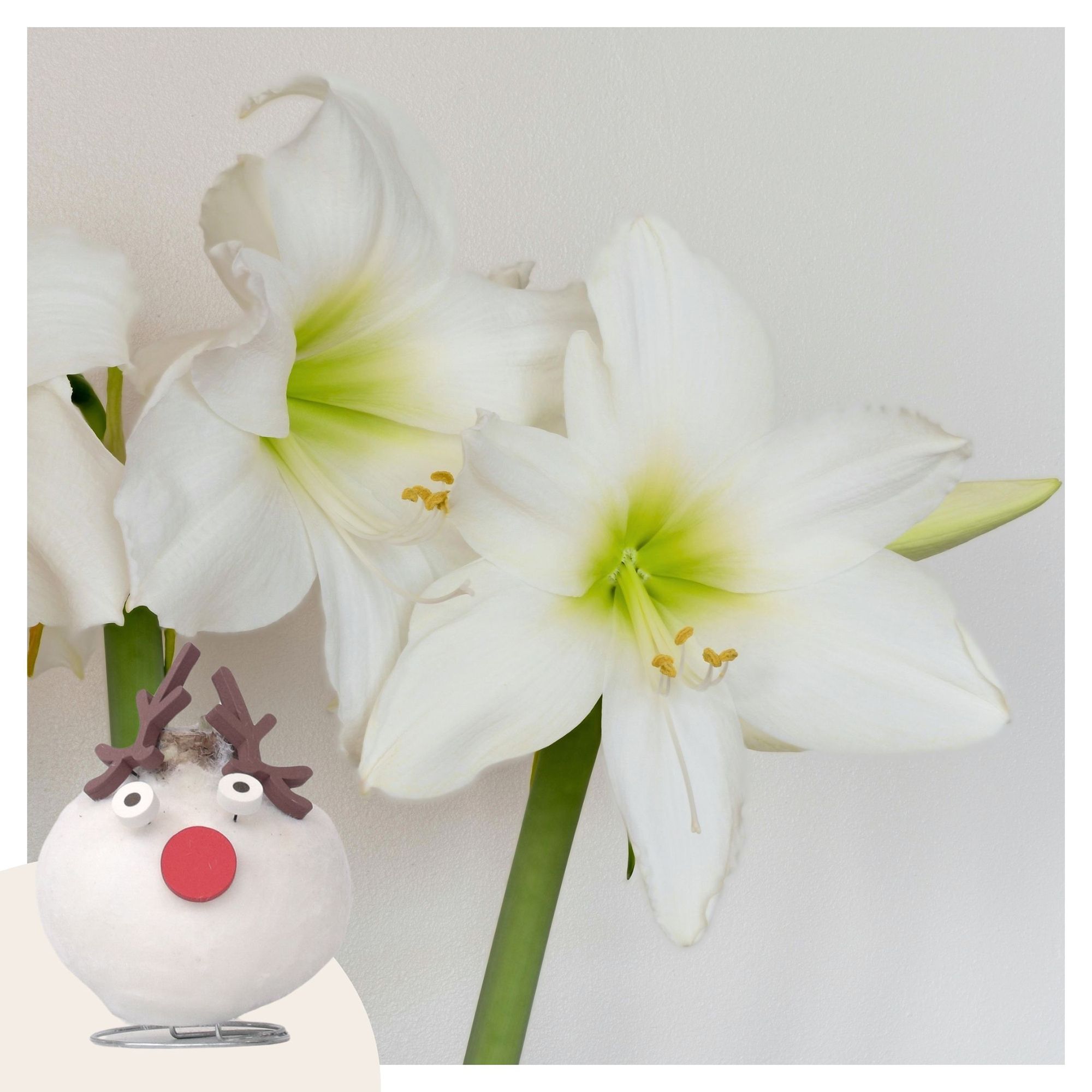 Mit der Amaryllis von PFLANZENFREUND bringst du Weihnachtsstimmung in dein Zuhause! Du erhältst die Amaryllis-Zwiebel mit Edelstahl-Fuß mit Weihnachts-Motiv.