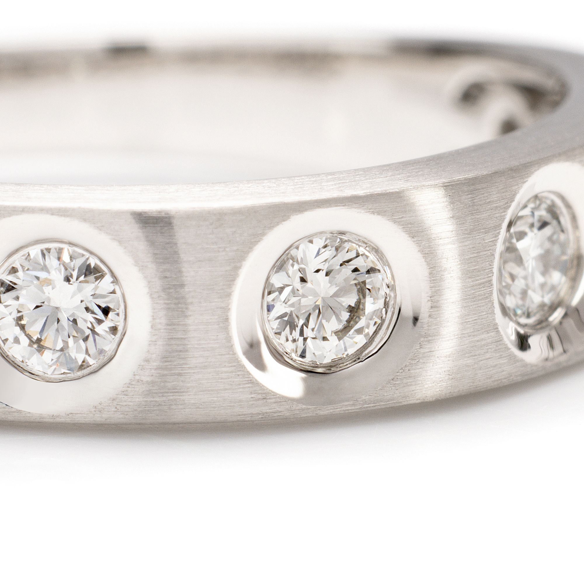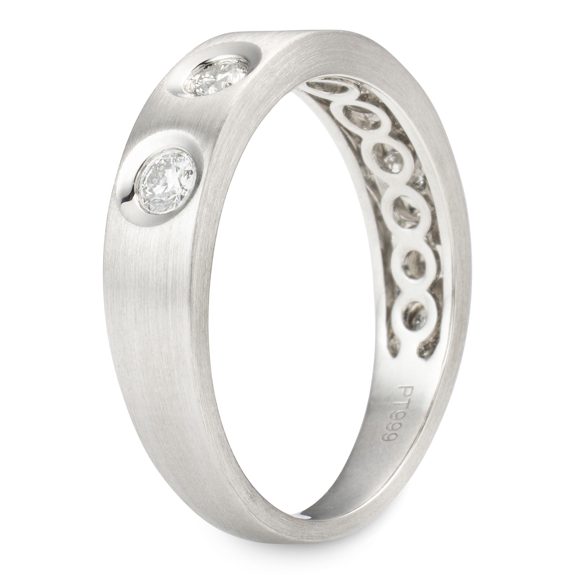 PLATINITY präsentiert einen außergewöhnlichen Ring, der pure Exklusivität und meisterhafte Handwerkskunst verkörpert: 5 Diamanten, lupenrein und in hochfeinem Weiß, strahlen in Spiegelfassungen und werden von mattiertem Platin 999 umrahmt – ein Design, das selten auf dem Markt zu finden ist.