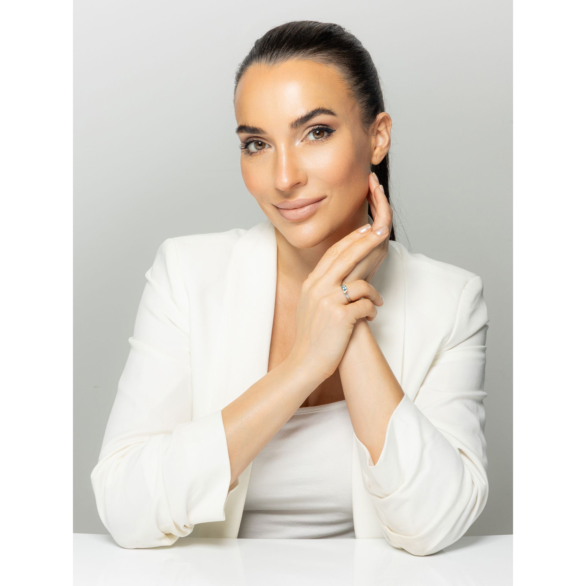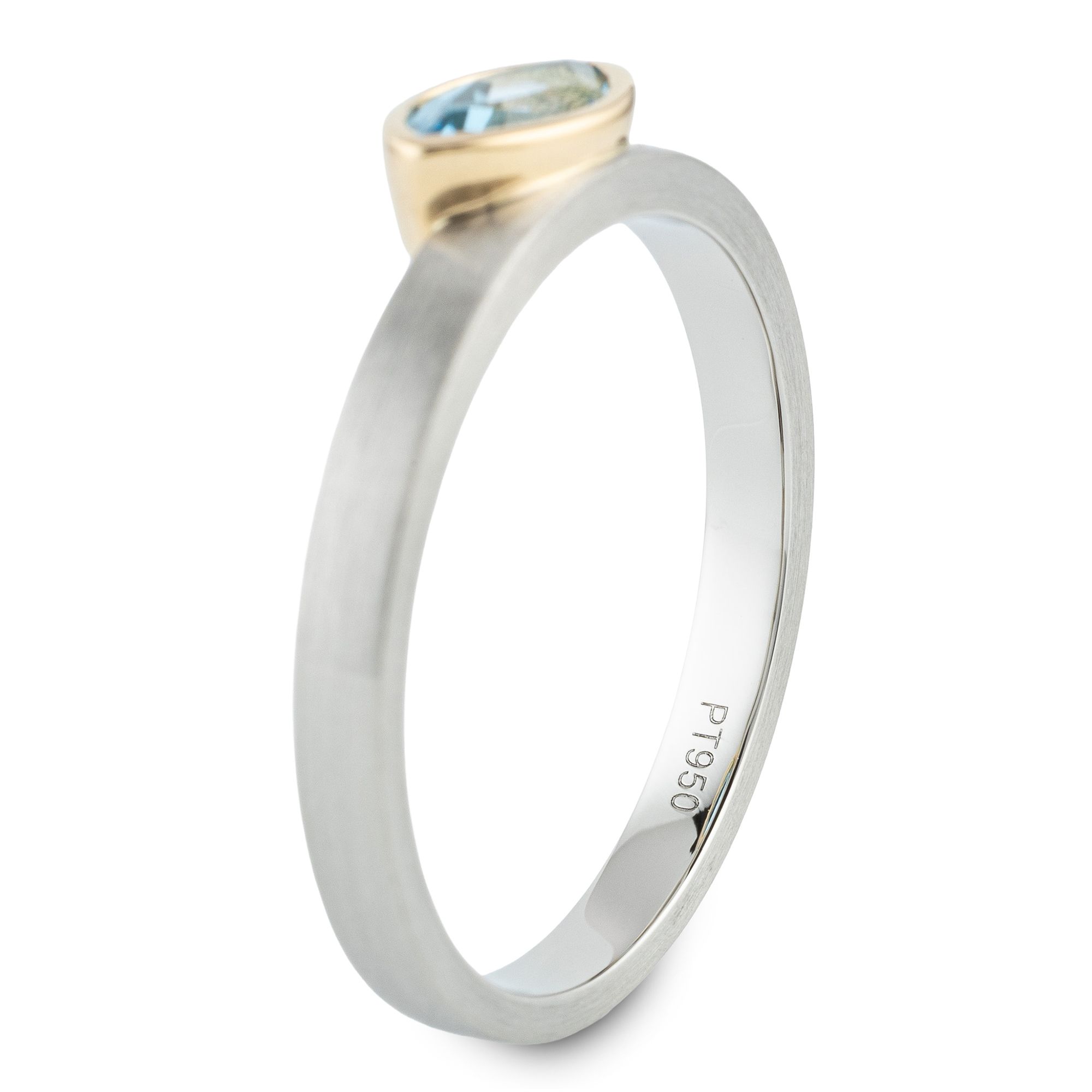 Der Ring von PLATINITY setzt einen behandelten Swiss Blautopas im Navetteschliff wirkungsvoll in Szene