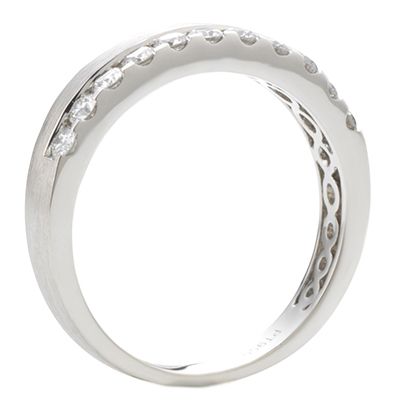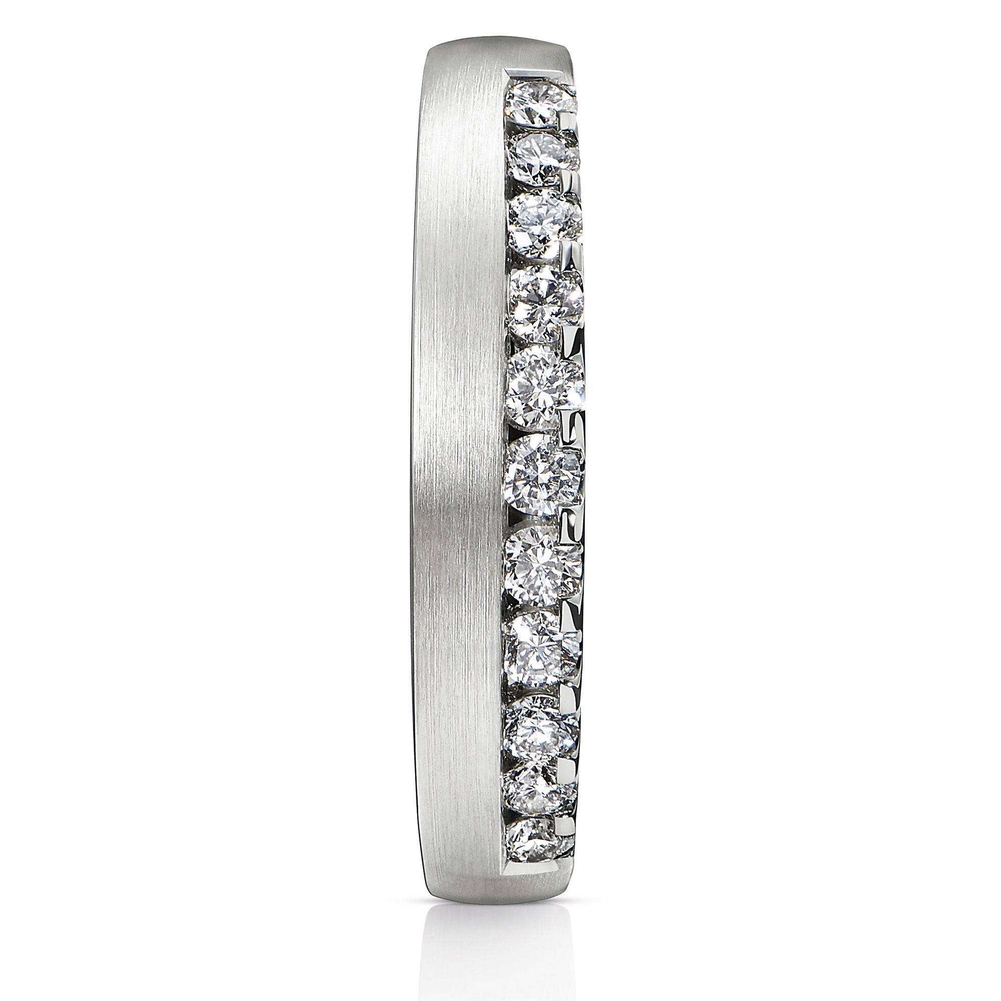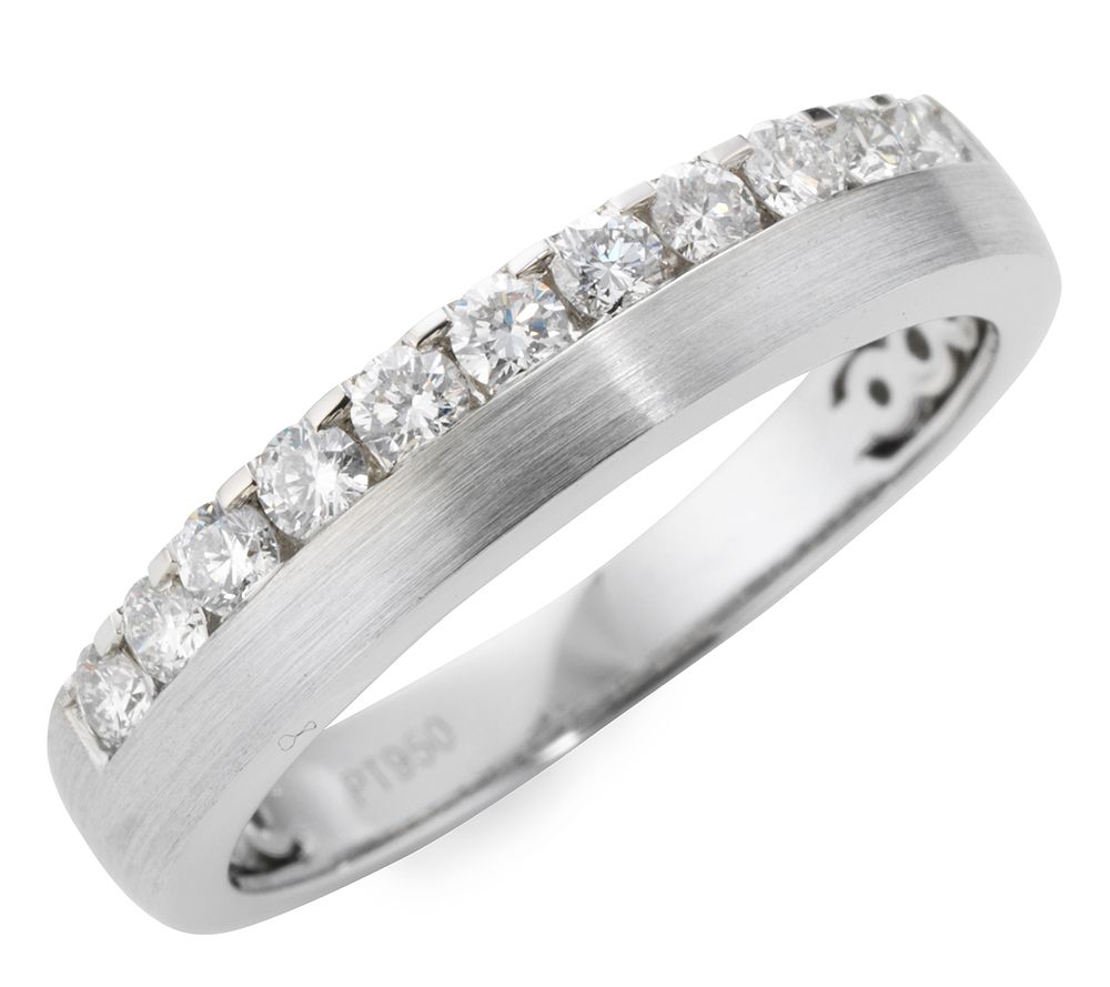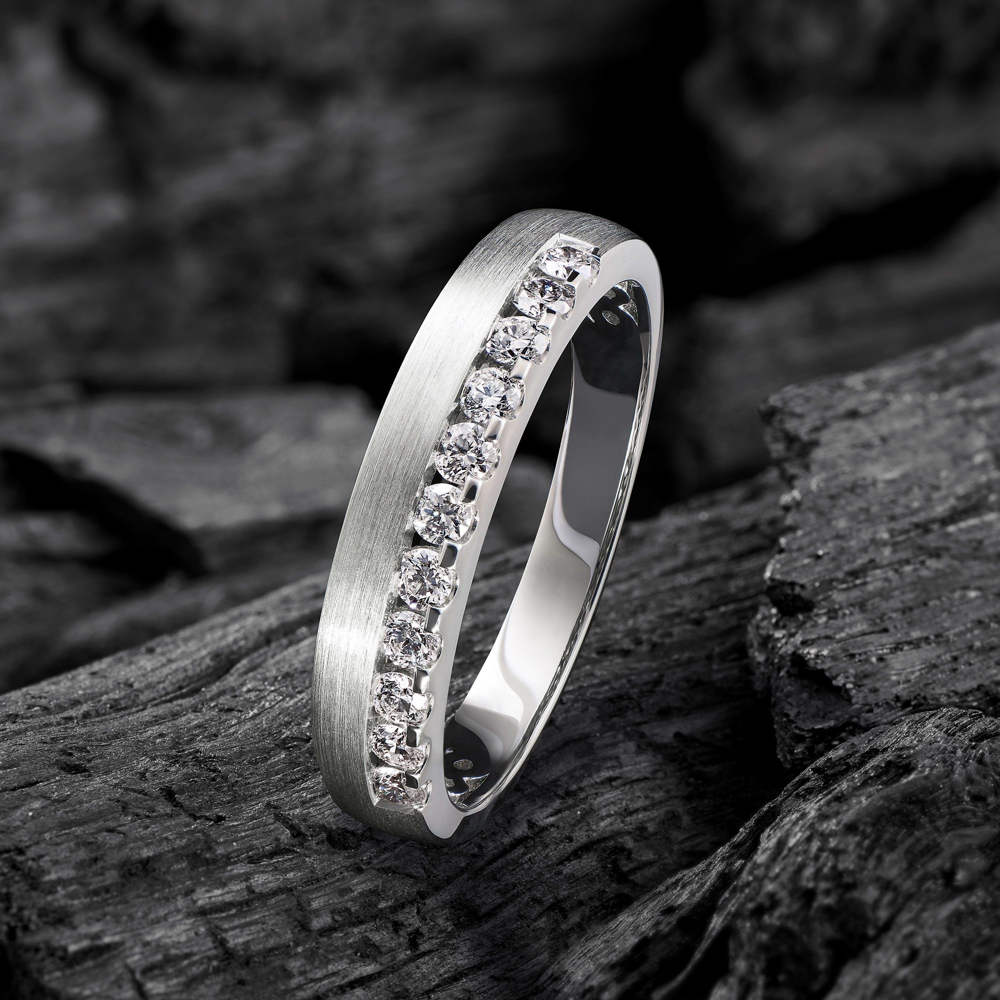 Platinkenner könnten sich auf den ersten Blick in das kühle, dezente Design verlieben: An einer Ringseite sitzt das Brillantband, auf der anderen präsentiert sich Platin mit mattiertem Finish. So cool, so modern, so frisch – ein Ring, der mit Begeisterung getragen werden will!