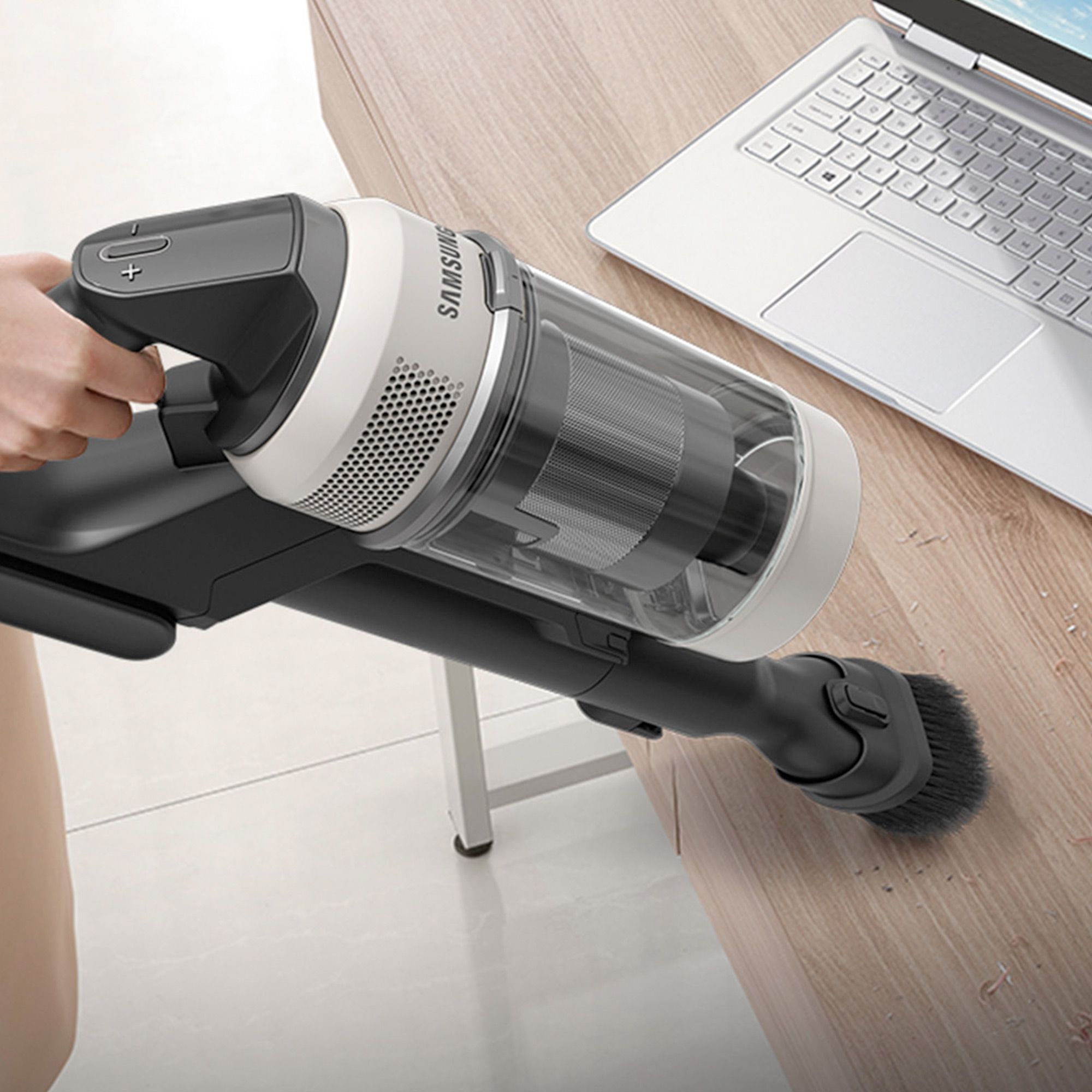 Erleichtert die tägliche Reinigung deines Zuhauses spürbar: Der SAMSUNG Bespoke AI Jet PetPRO vereint innovative Technologie und starke Leistung. Mit dem AI Cleaning Mode passt sich das Gerät intelligent an unterschiedliche Bodenbeläge an und macht das Staubsaugen so besonders komfortabel. Die Jet Dual+ Bürste verhindert Verheddern und der wechselbare Akku sorgt für bis zu 60 Minuten Laufzeit – perfekt für ausgedehnte Reinigungseinheiten. Und die All-in-One Clean Station sorgt für eine besonders hygienische Staubentleerung und lädt deinen Handstaubsauger gleichzeitig auf.