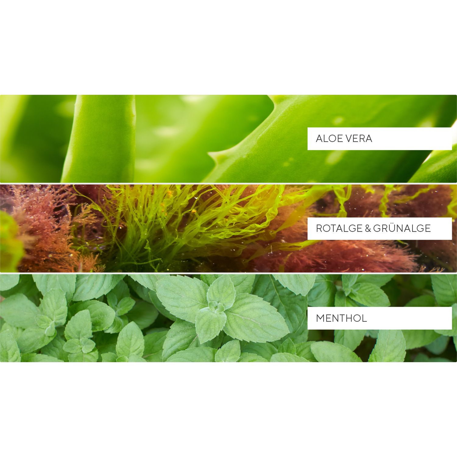 Aqua, Propylene Glycol, Alcohol Denat., Glycerin, Chlorella Vulgaris (Green Algae) Extract, Corallina Officinalis (Red Algae) Extract, Aloe Barbadensis Leaf Juice, Menthol, Acrylates/C10-30 Alkyl Acrylate Crosspolymer, Triethanolamine, Vanillyl Butyl Ether, Cocamidopropyl Betaine, Ethylhexylglycerin, Disodium EDTA, Sodium Chloride, Phenoxyethanol, CI 42090