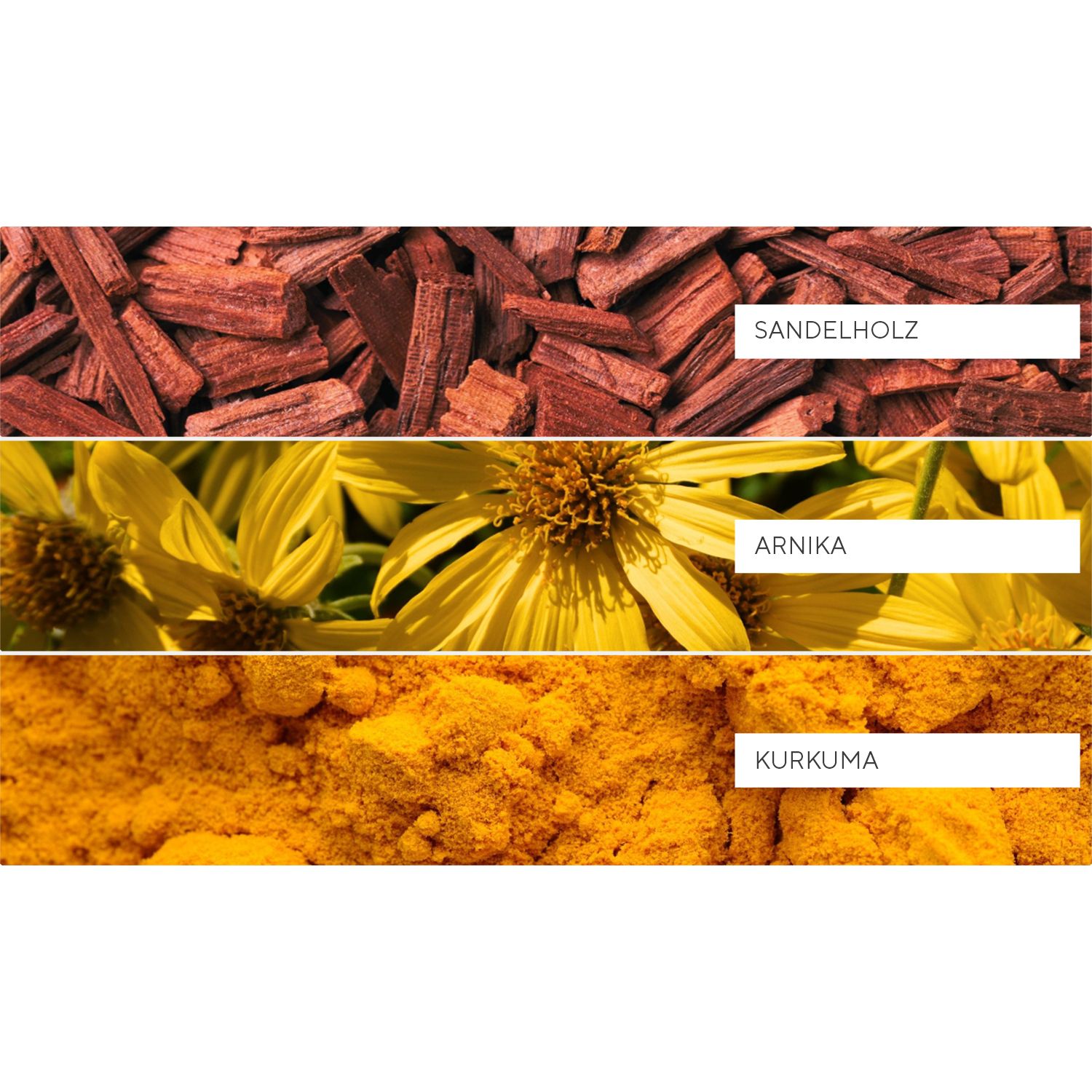 • angereichert mit beruhigender Arnika, Sandelholz und wärmenden Kurkuma-Extrakten zur Entspannung