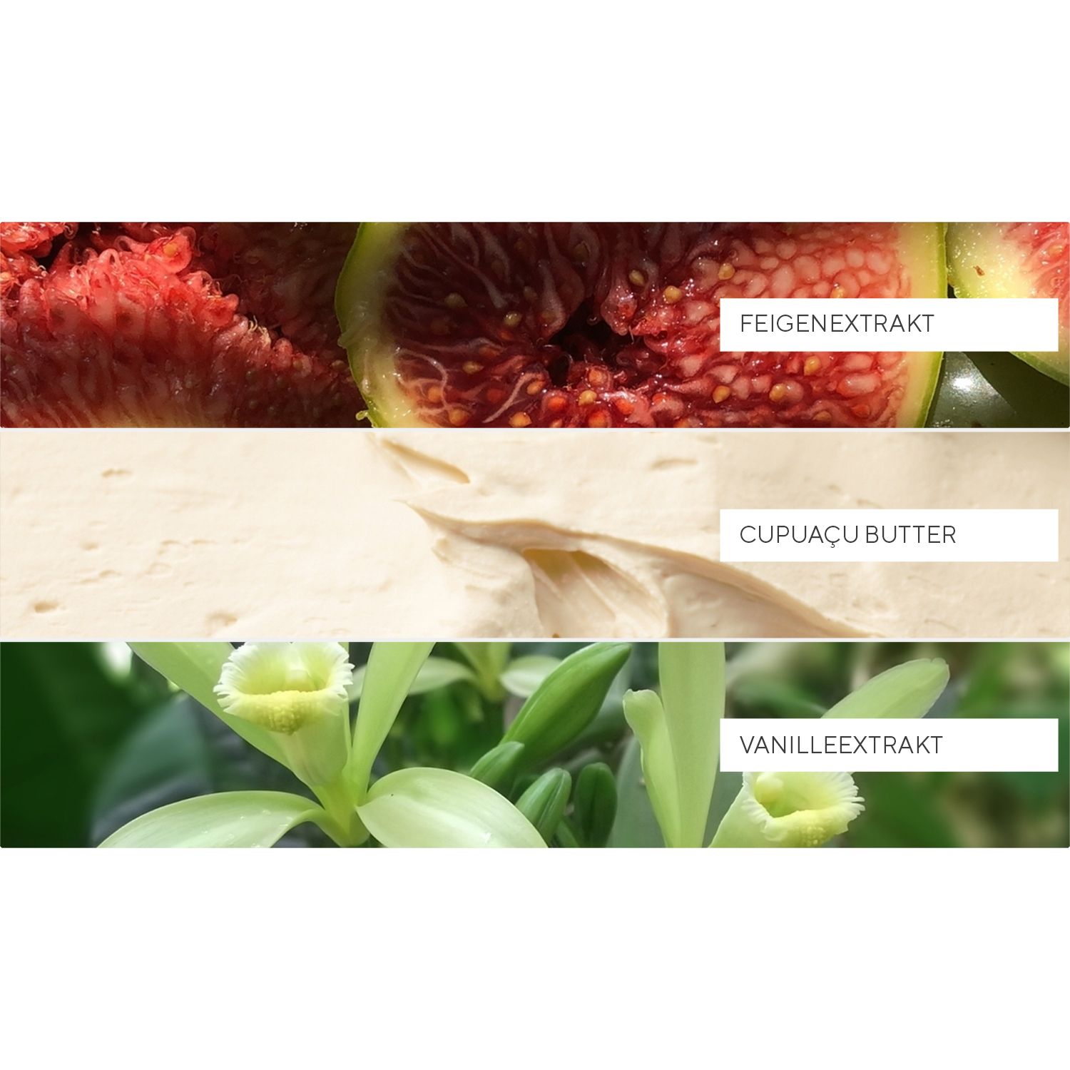 - angereichert mit Vanillebohnen- und Feigenextrakten sowie nährenden Shea- und Cupuaçu-Buttern
