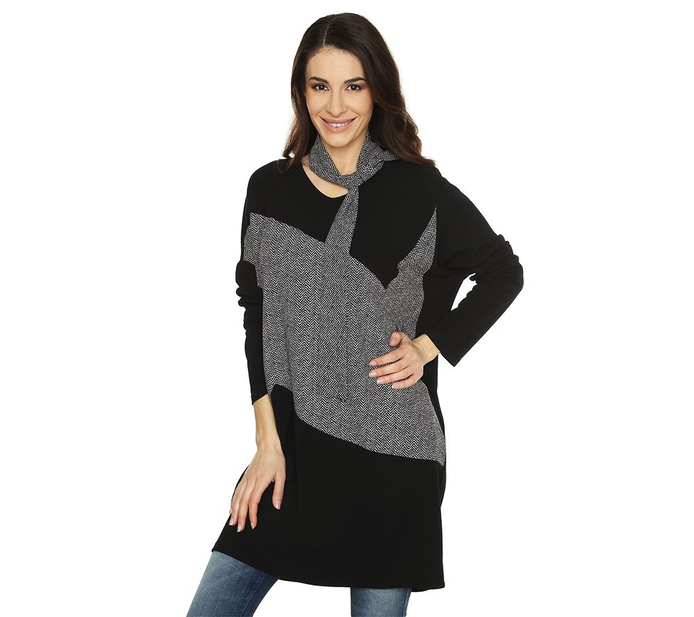 Diese stilvolle Tunika von SOTTOMARINO ist ein wahrer Figurenschmeichler: Ihre lockere Passform und der feminine V-Auschnitt kaschieren und betonen genau die richtigen Körperstellen. Die langen Fledermausärmel sind nicht nur modisch, sie halten auch an kühlen Abenden schön warm – genauso wie der bedruckte Schal, der die Tunika ergänzt.