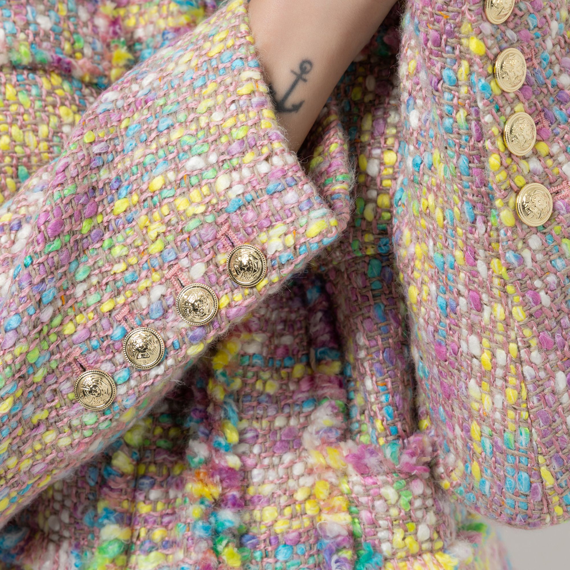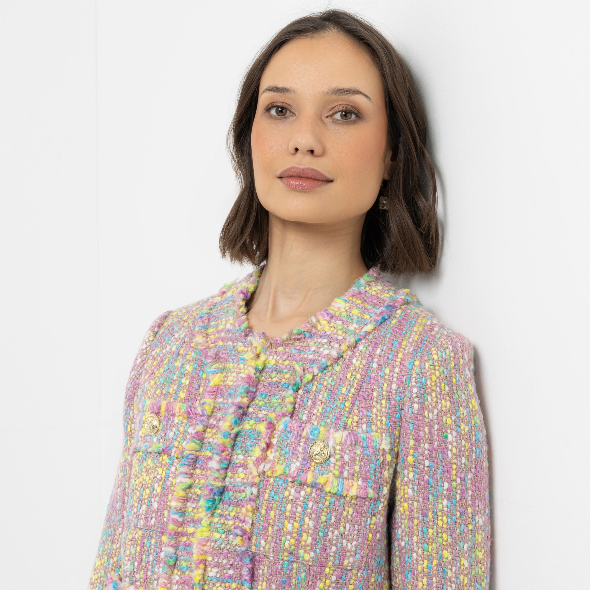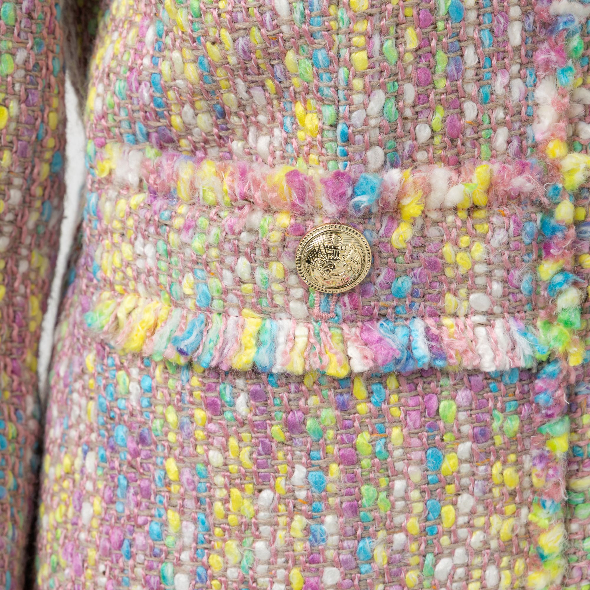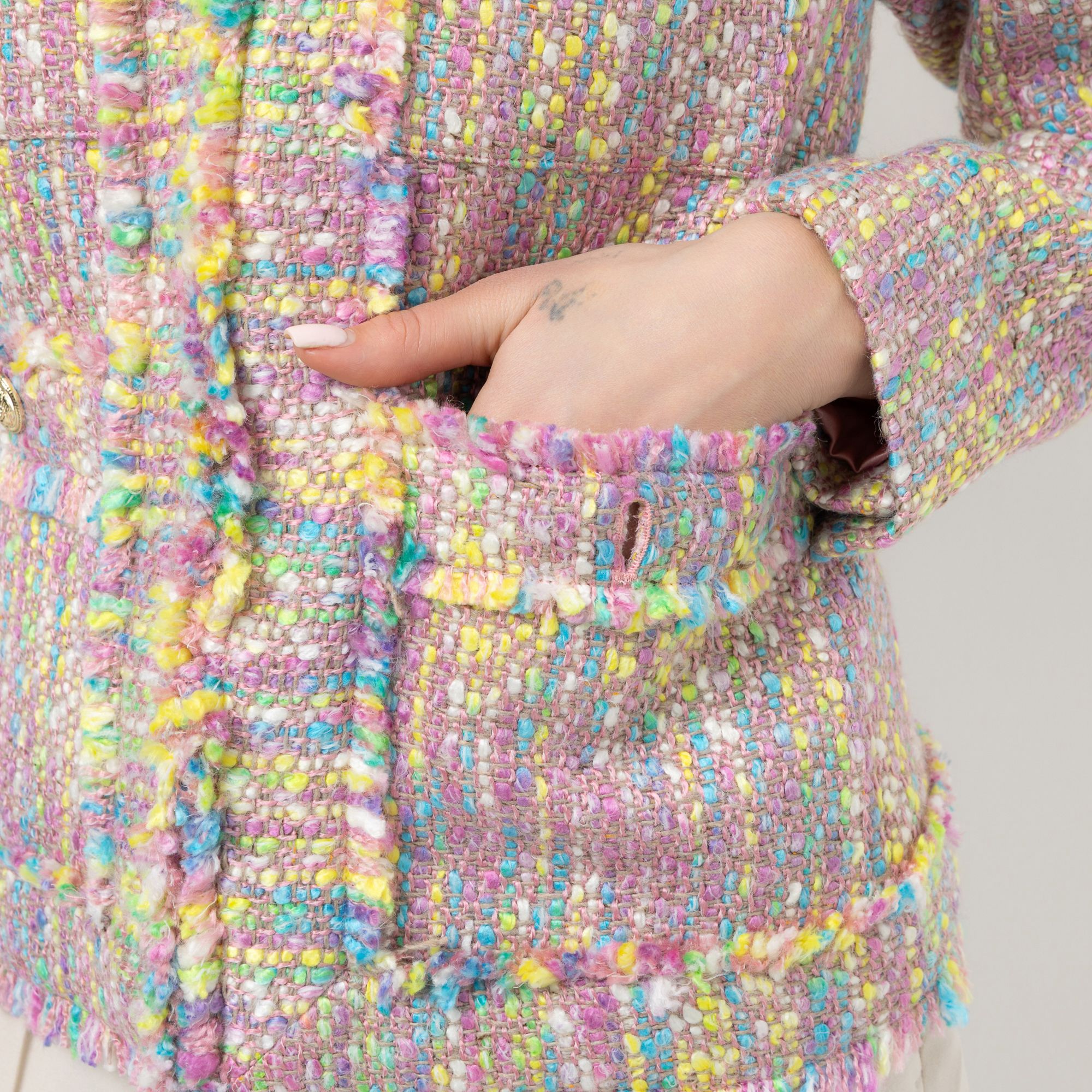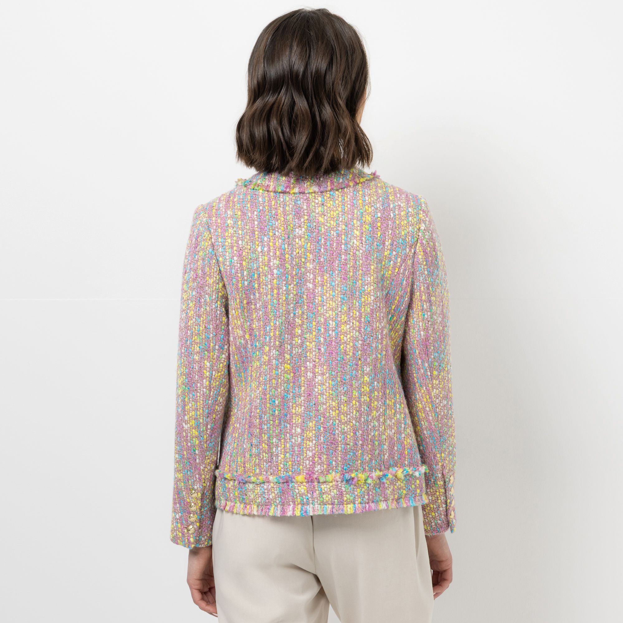 Figurumspielender Designer-Blazer von STEFFEN SCHRAUT in Bouclé-Optik mit ausgefransten Kanten und edlen Schmuckknöpfen für einen stilvollen Auftritt.