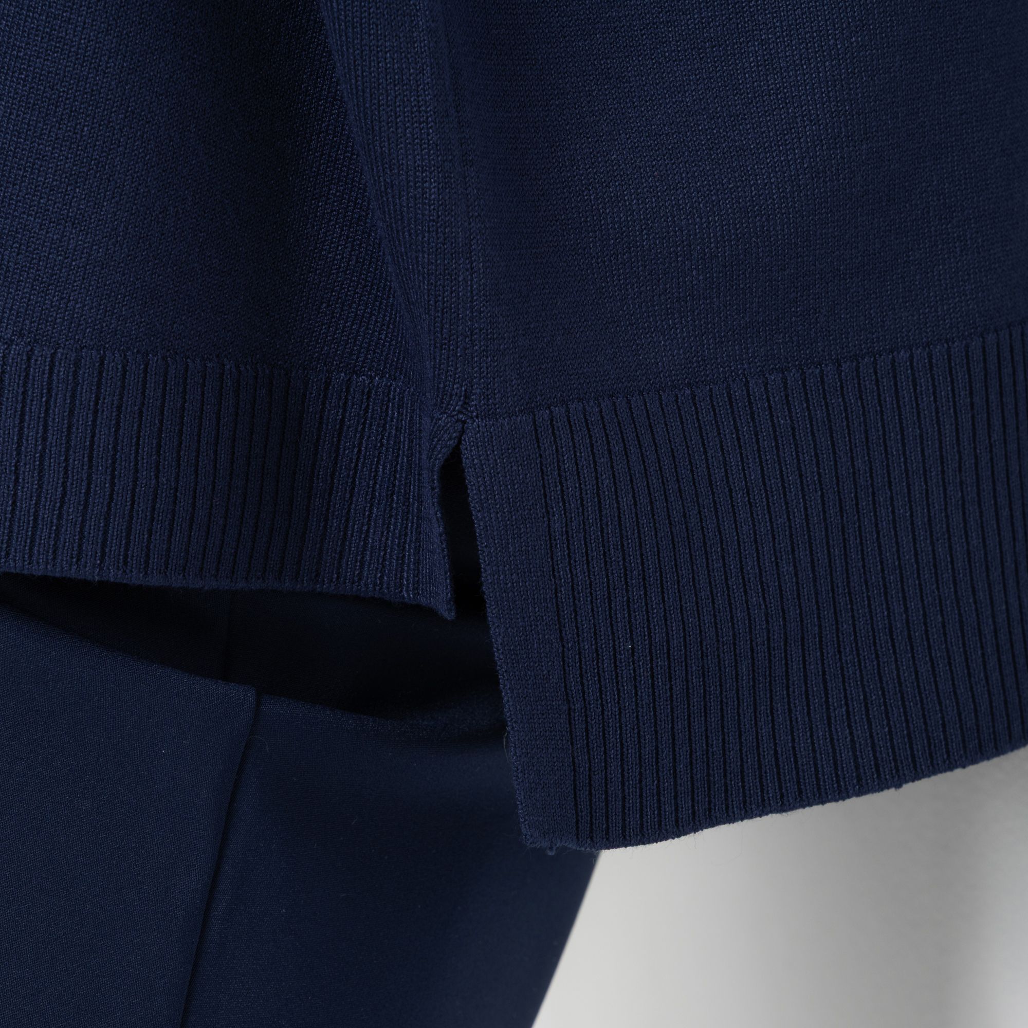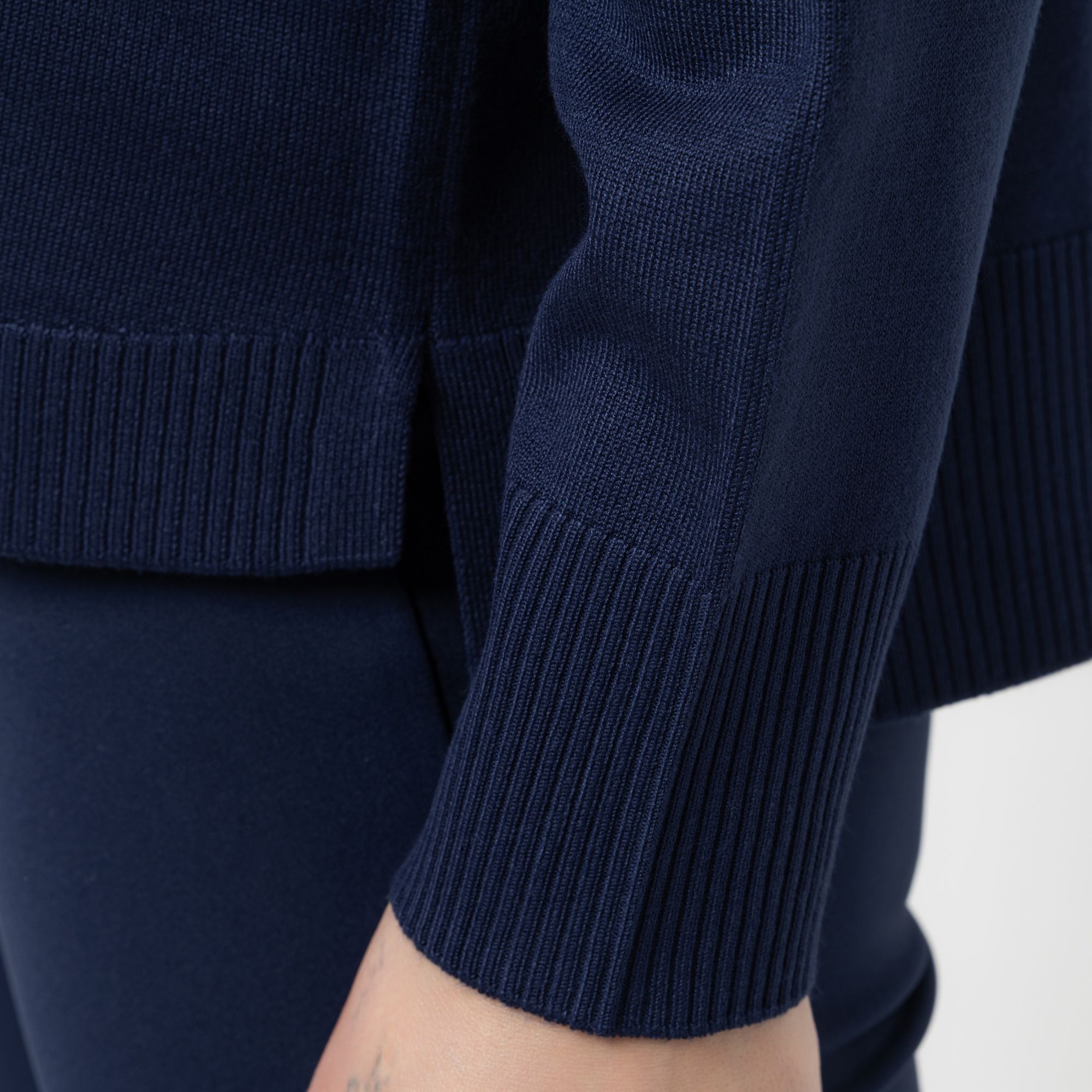 • Rippenbundabschluss an Ausschnitt, Ärmelsaum und Saum