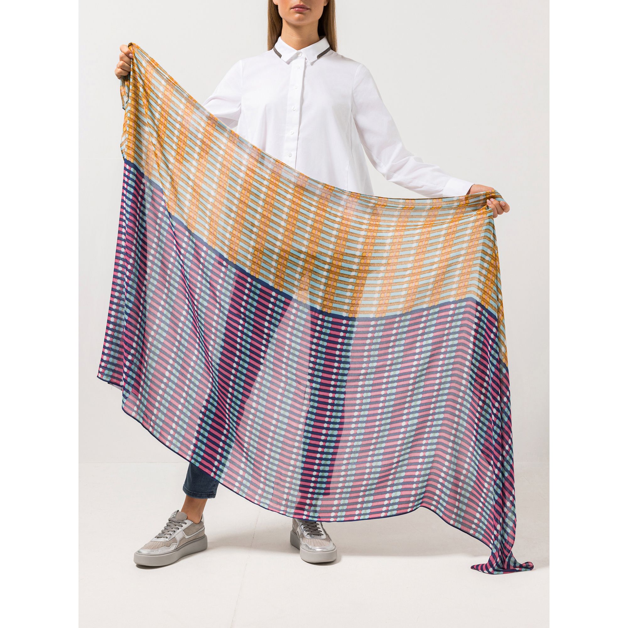Das bunte Muster des STEFFEN SCHRAUT Tuchs aus Viskose macht es zum Allrounder, der sich mit vielen Stylings kombinieren lässt.