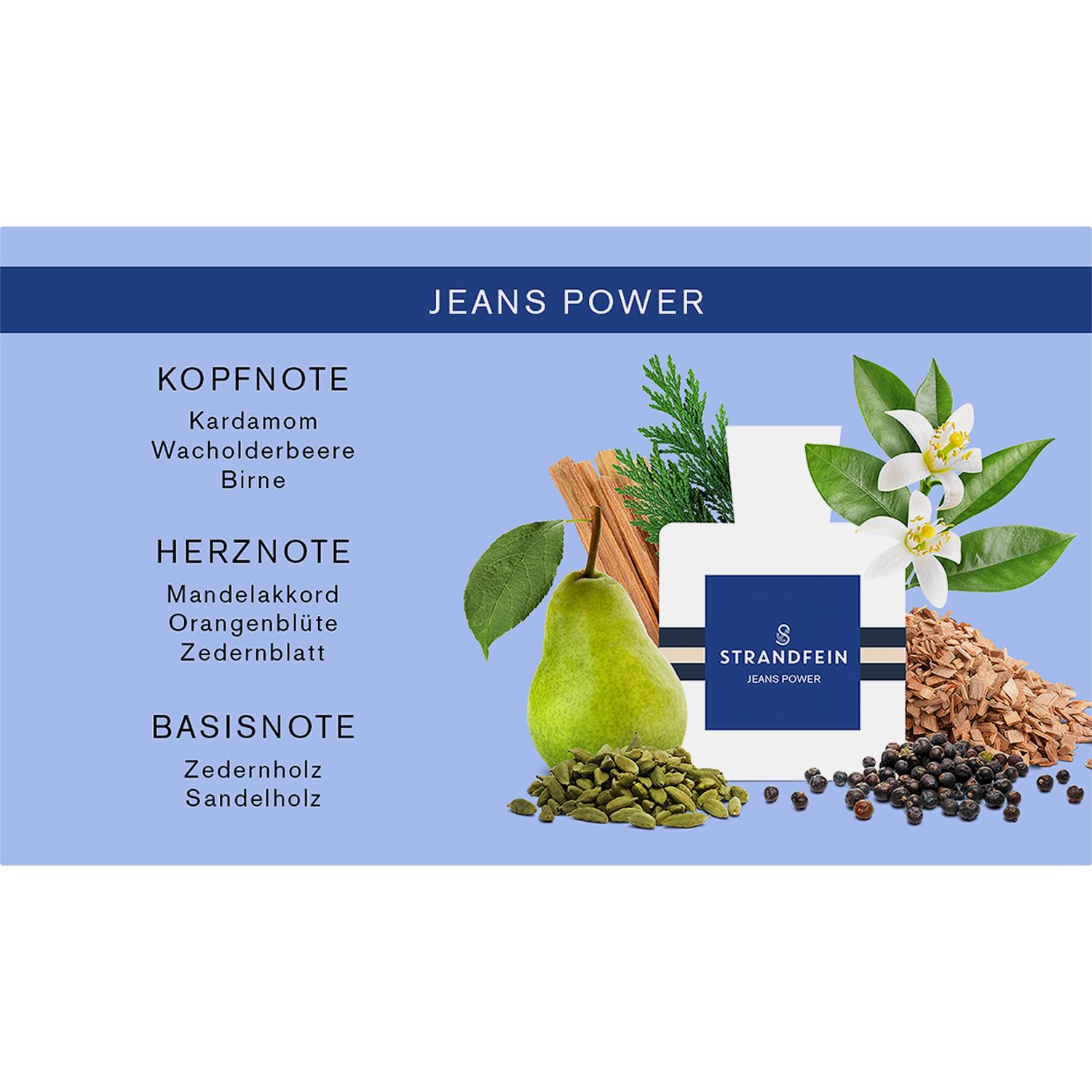 Der perfekte Duft für den schwungvollen Auftritt! Das Jeans Power Eau de Parfum von STRANDFEIN umspielt dich mit einer fantastischen Duftkombination aus Nuancen wie Kardamom und Wacholder, Orangen und Zedernholz – für einen sinnlichen Kick voller Charisma.