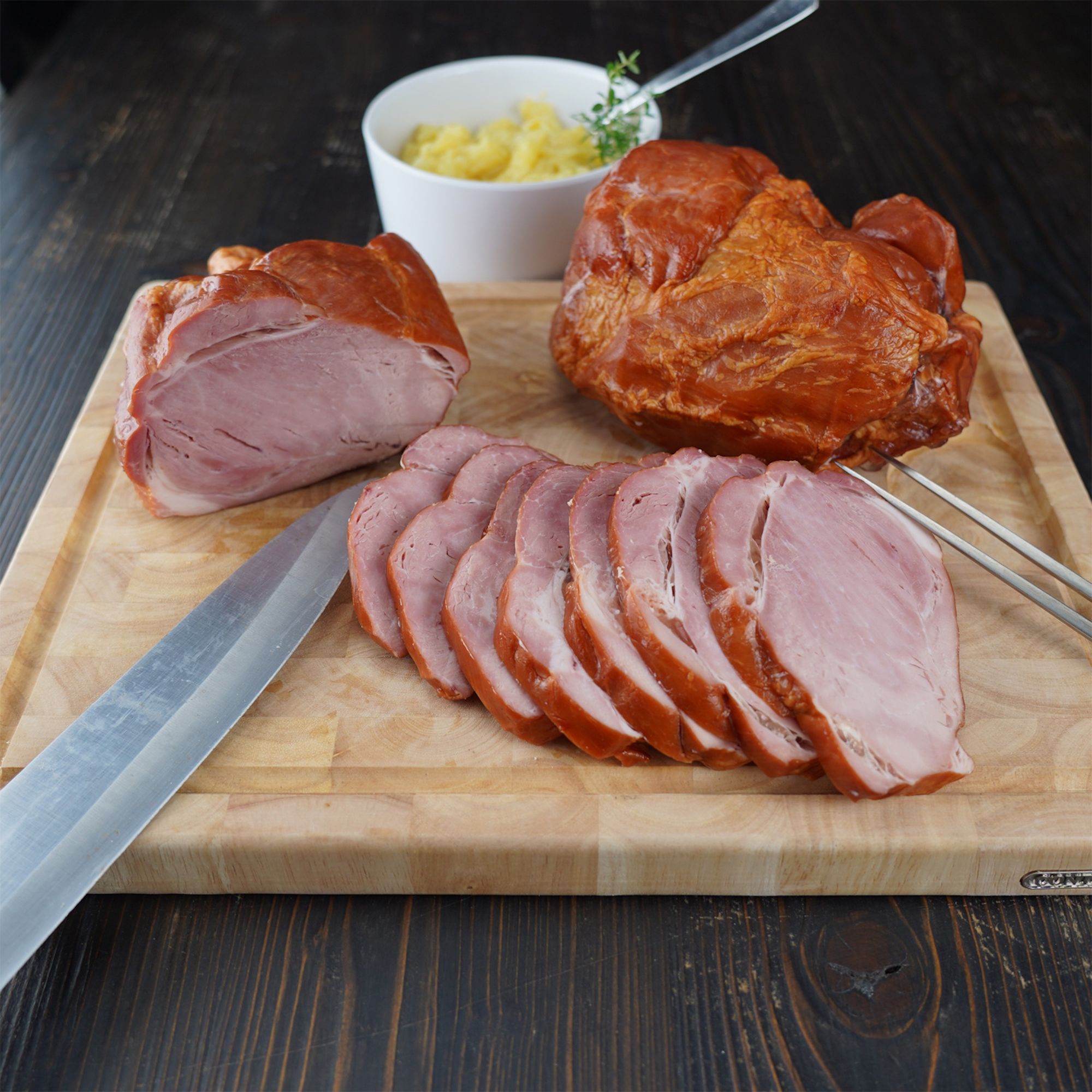 Köstliches Highlight für deine Festtagsmenüs: Das zart geräucherte Schäufele von SCHWARZWALD-MANUFAKTUR TANNENGLÜCK lässt sich ganz unkompliziert kalt oder warm genießen.