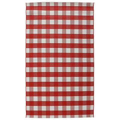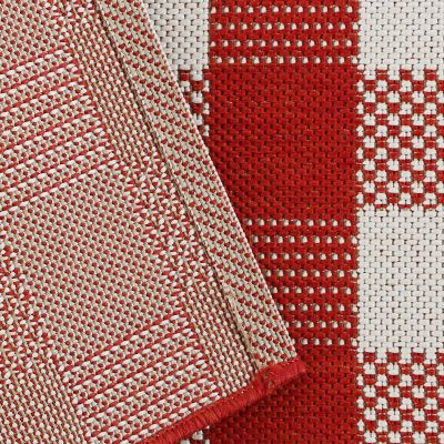 Der flach gewebte Teppich mit Karo-Design ist auch für draußen geeignet. Er ist sehr strapazierfähig und belastbar.