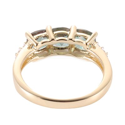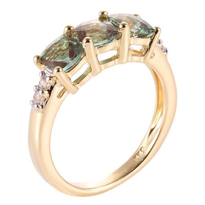 Ein ausdrucksvoller, schöner Rivière-Ring: besetzt mit drei grünen Tibetaniten und vier weißen Saphiren. Der filigrane Ring misst im Kopf ca. 0,50 cm und hat eine Schiene aus Gold, die sich auf ca. 2,30 mm verjüngt.