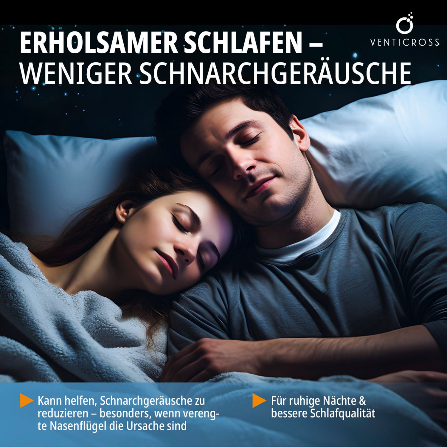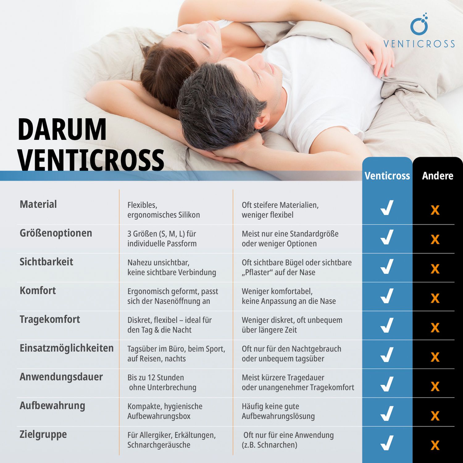 Der VENTICROSS® Nasen-Spreizer ist eine sanfte und diskrete Lösung für alle, die ihre Nasenatmung verbessern möchten - ob im Alltag, beim Sport oder in der Nacht. Der ergonomisch geformte Spreizer aus flexiblem Silikon öffnet behutsam die Nasenflügel und erleichtert so das Atmen durch die Nase. Es bietet Unterstützung bei Nasenverengungen und kann auch Schnarchgeräusche verringern, die durch verengte Nasenflügel entstehen. Besonders in der Pollensaison oder während der Erkältungszeit ist er ein wertvoller Begleiter für unbeschwerte Atmung im Alltag.