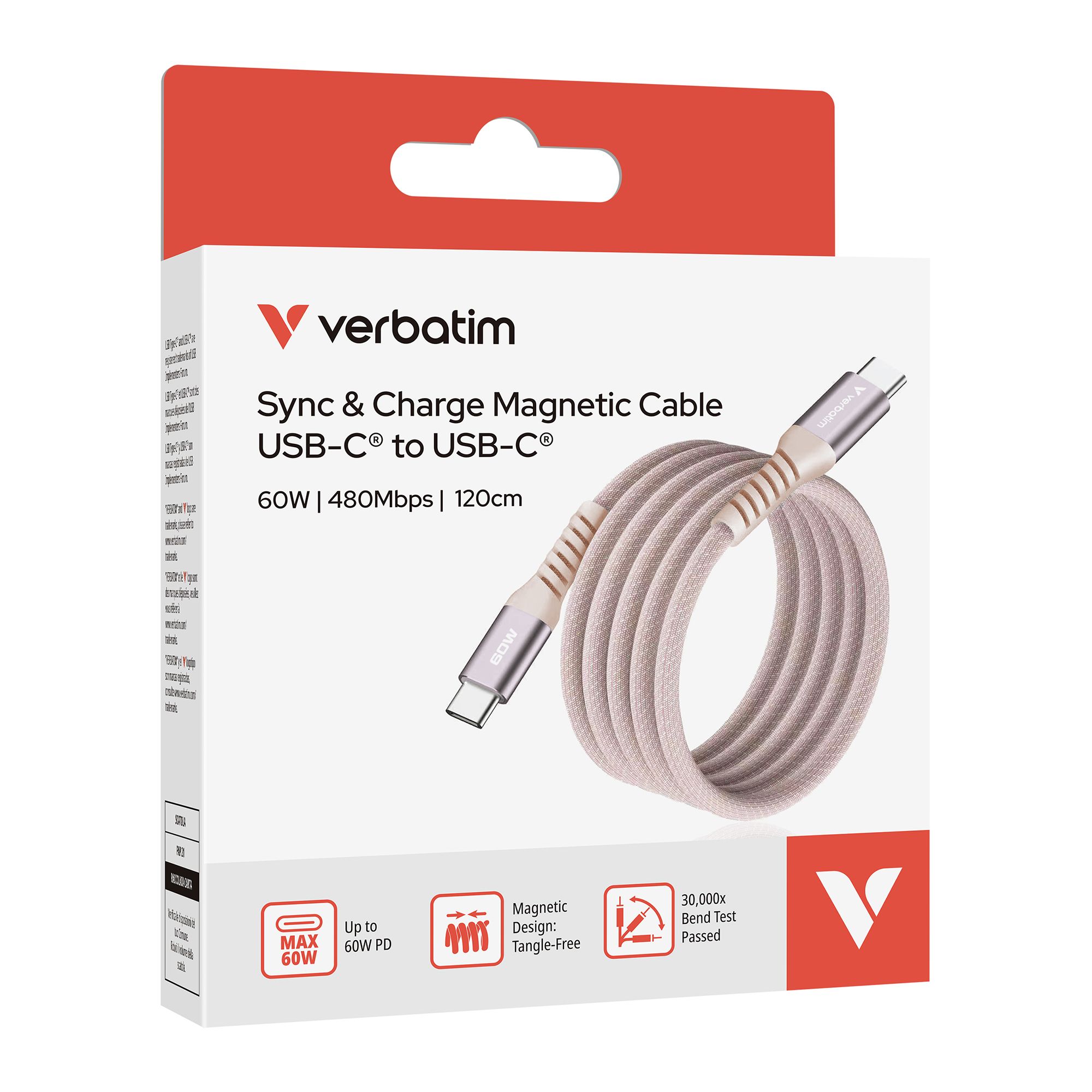 Das hochwertige SYNC & Charge USB-C-zu-USB-C-Kabel von VERBATIM verfügt über ein magnetisches Spiraldesign für ordentliche, verwicklungsfreie Aufbewahrung. Es unterstützt schnelles Laden bis zu 60 W und Datenübertragung bis 480 Mbps und ist ieal für Laptops, Tablets, Smartphones und andere USB-C-Geräte.