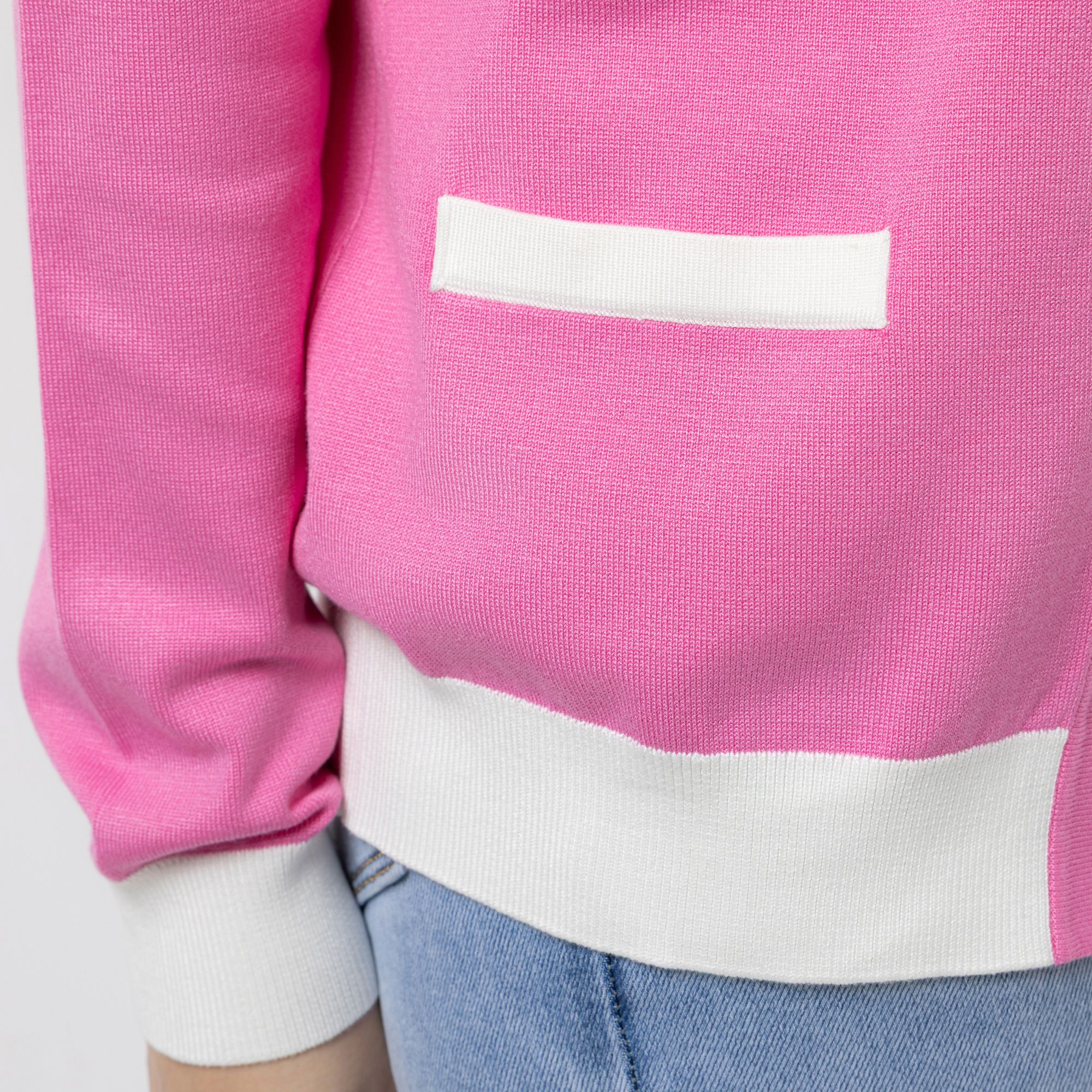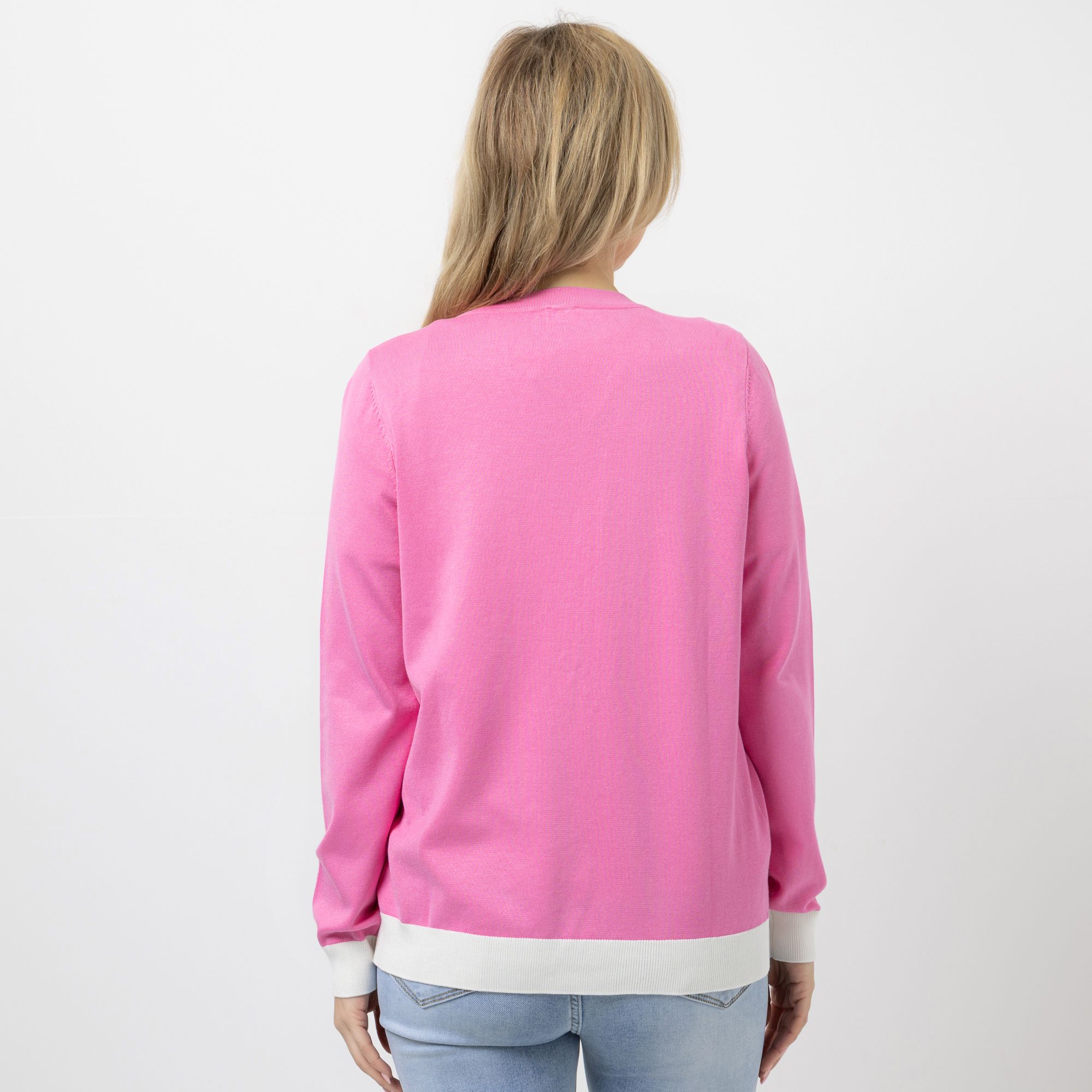 Mit ihrem modernen Häkchen-Verschluss und den liebevoll eingearbeiteten Kontrast-Details bringt die VIA MILANO Strickjacke einen frischen Akzent in deine Garderobe.