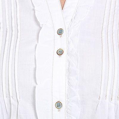 Die VIA MILANO 3/4-Arm-Tunika ist wie eine Bluse mit Stehkragen, Schulterpasse, Knopfleiste mit Rüschen sowie mit Brustabnähern genäht.