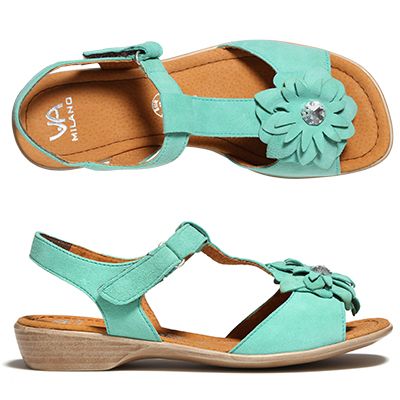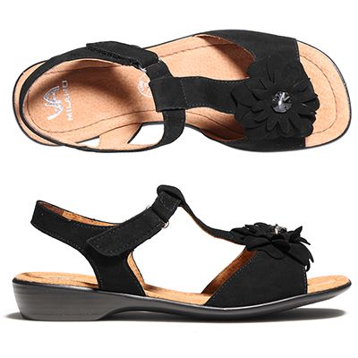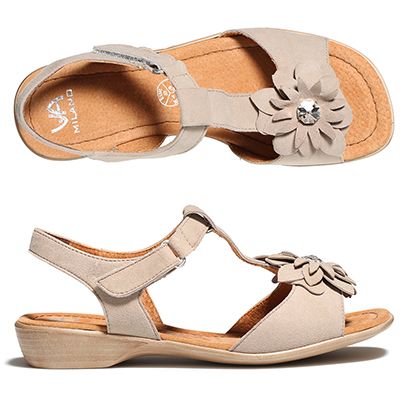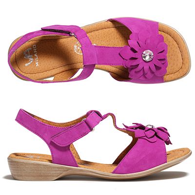 Die Sandale von VIA MILANO kommt im tollen Sommer-Look. Sie ist mit einer aparten Blüten-Applikation versehen und aus geschmeidigem Veloursleder gearbeitet.