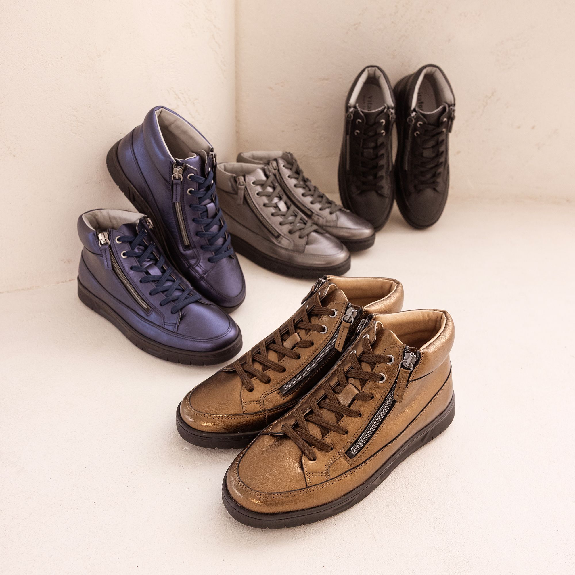 Erlebe urbanen Chic mit dem VITAFORM Hightop Sneaker! Das luxuriöse Softnappaleder mit glänzendem Metalliceffekt in edlen Farben verleiht jedem Outfit eine elegante Note. Farbig passende Schnürsenkel und tonige Nähte machen diesen Sneaker zum idealen Begleiter für Fashion-Begeisterte.