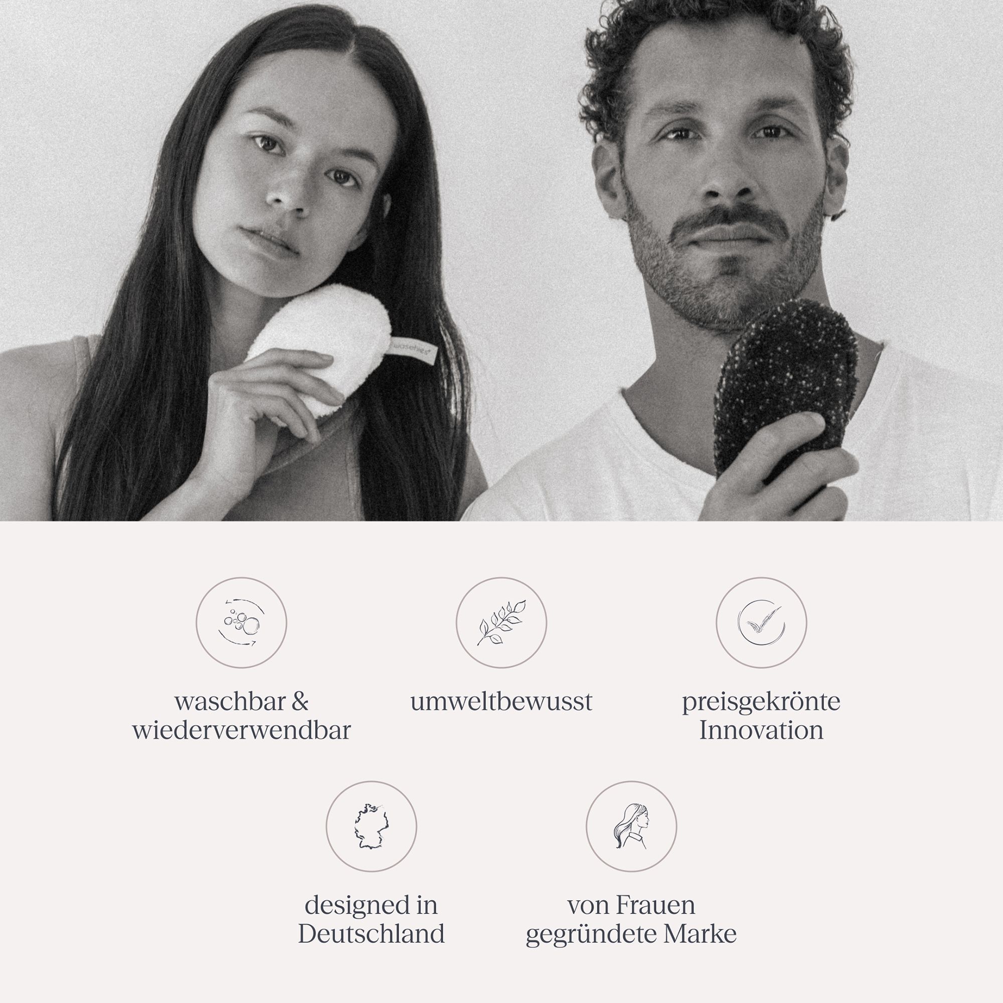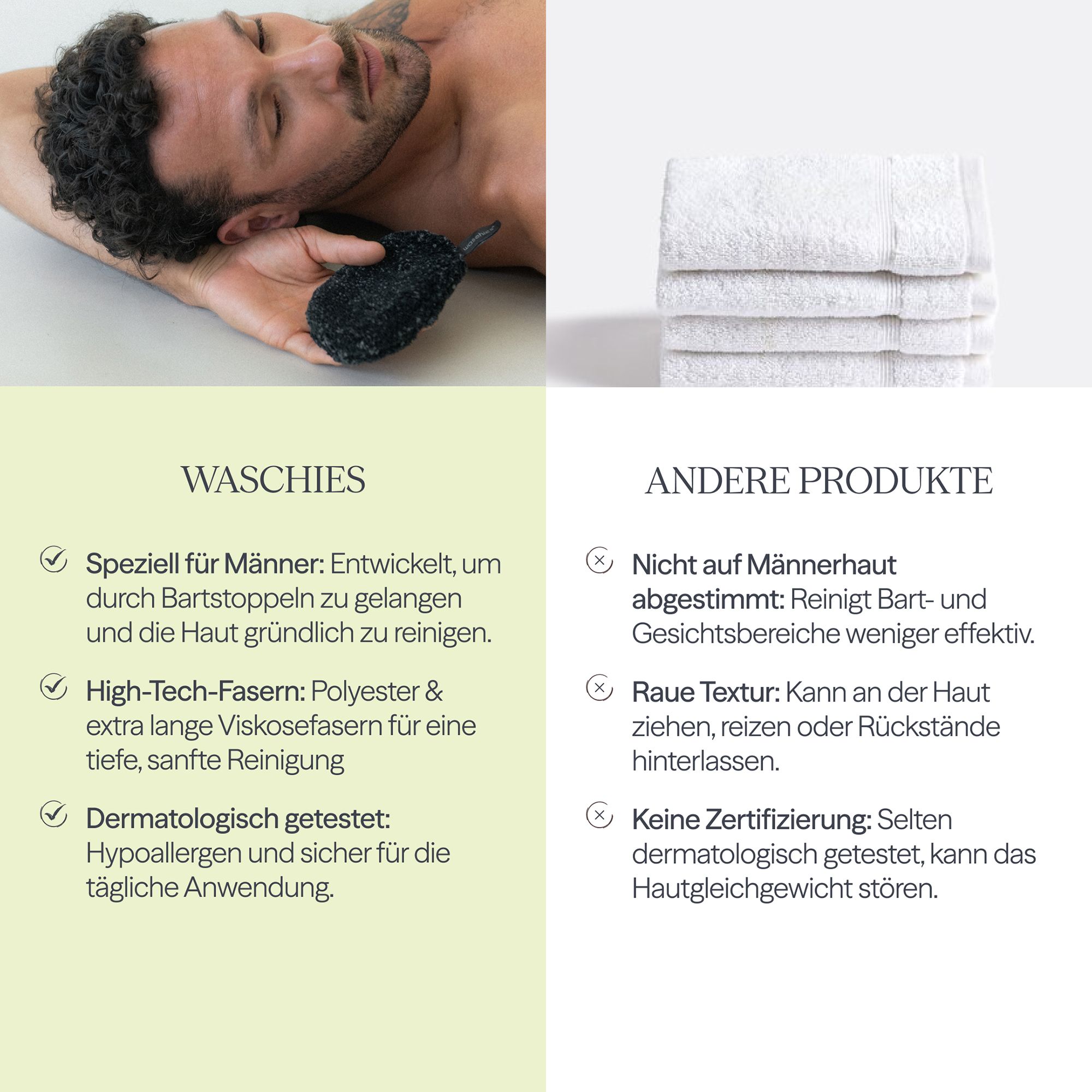 Must-haves für die männliche Bad-Ausstattung! Die wiederverwendbaren, fluffig-weichen WASCHIES® Pads machen die Hautreinigung zum Lieblingsschritt in deiner Pflegeroutine. Sie wurden speziell für Männerhaut entwickelt: Egal ob glatt rasiert, mit Bartstoppeln oder Bart – die Pads sorgen jeden Tag für eine frische und ausgeglichene Haut.