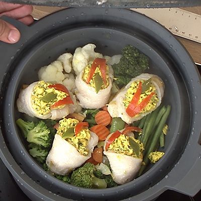 - multifunktionaler Dämpfeinsatz mit 5 Funktionen (Dämpfen, Kochen, Untersetzer, Spritzschutz, Sieb)