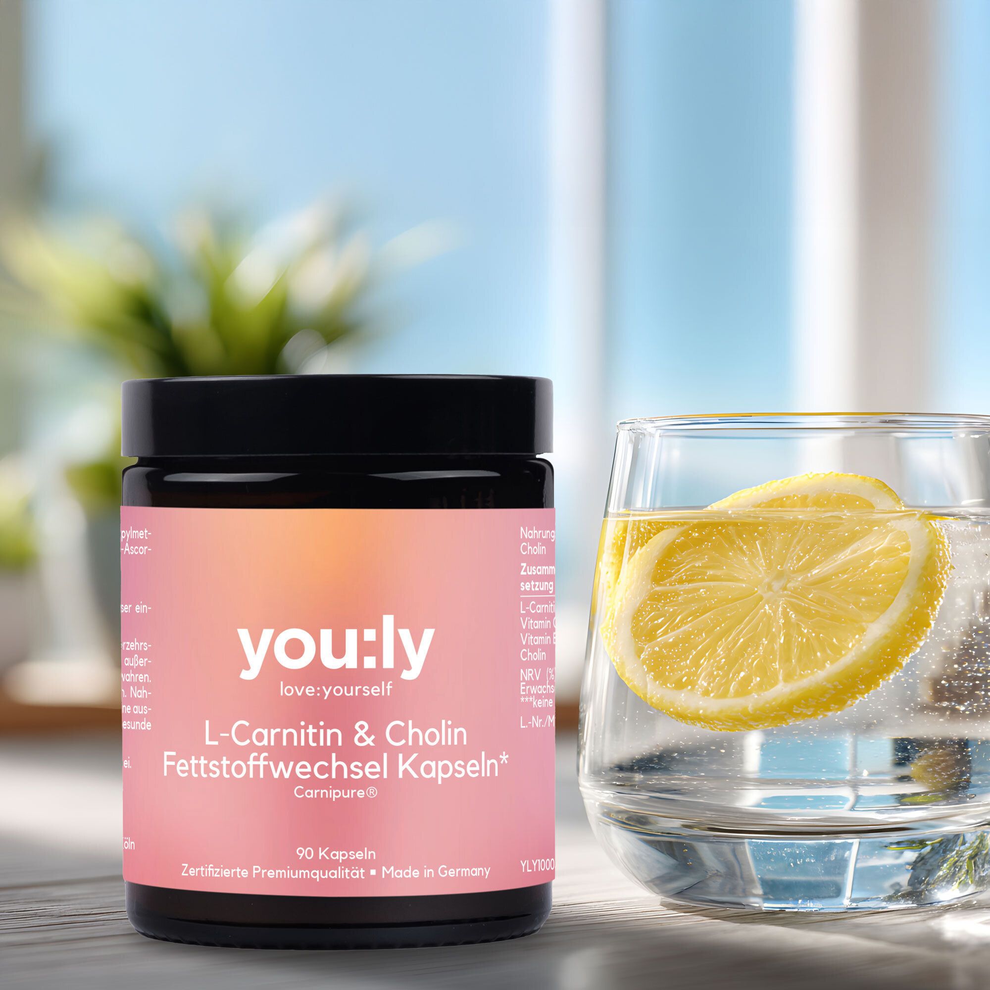 you:ly L-Carnitin mit Carnipure® ist ein Nahrungsergänzungsmittel mit L-Carnitin, Vitaminen und Cholin