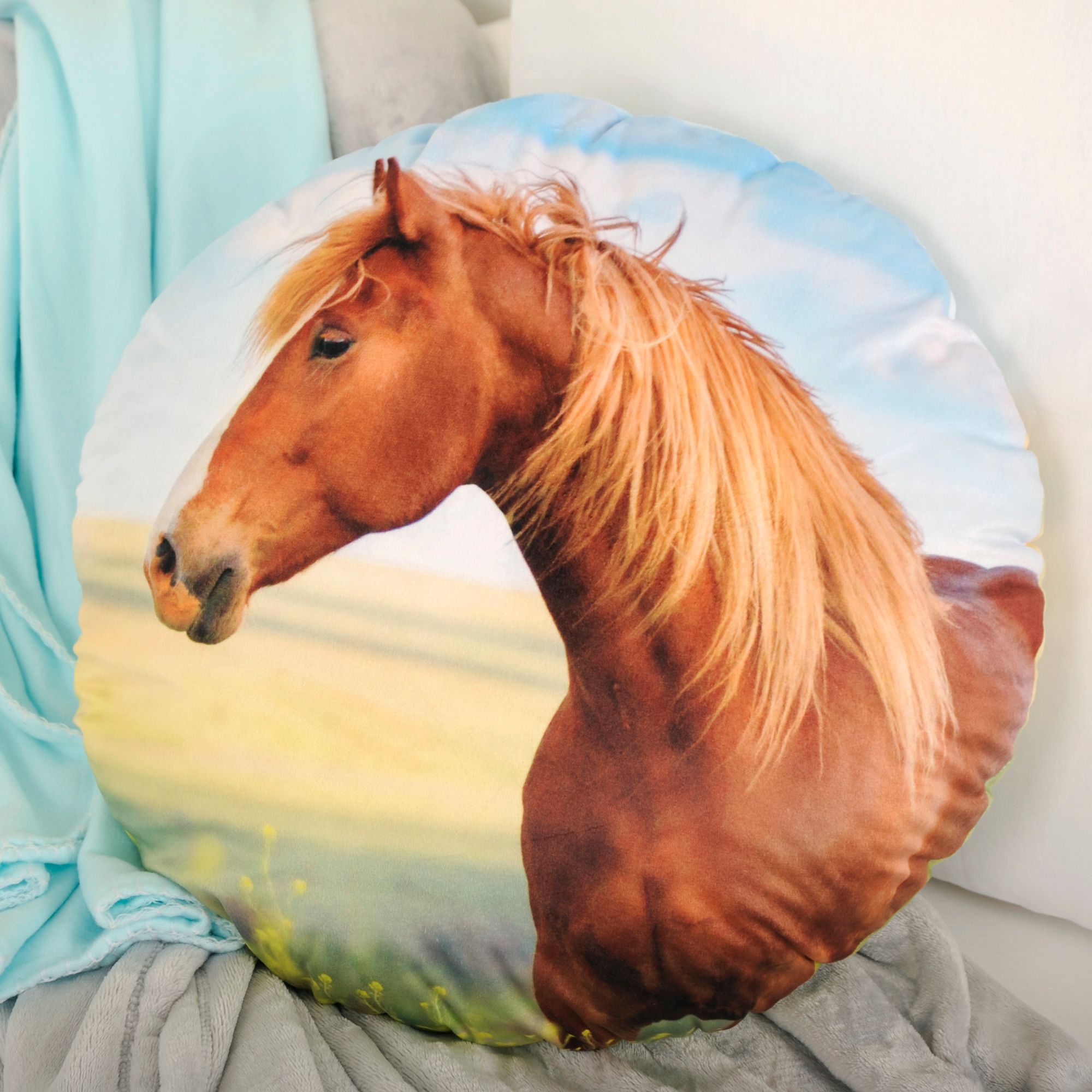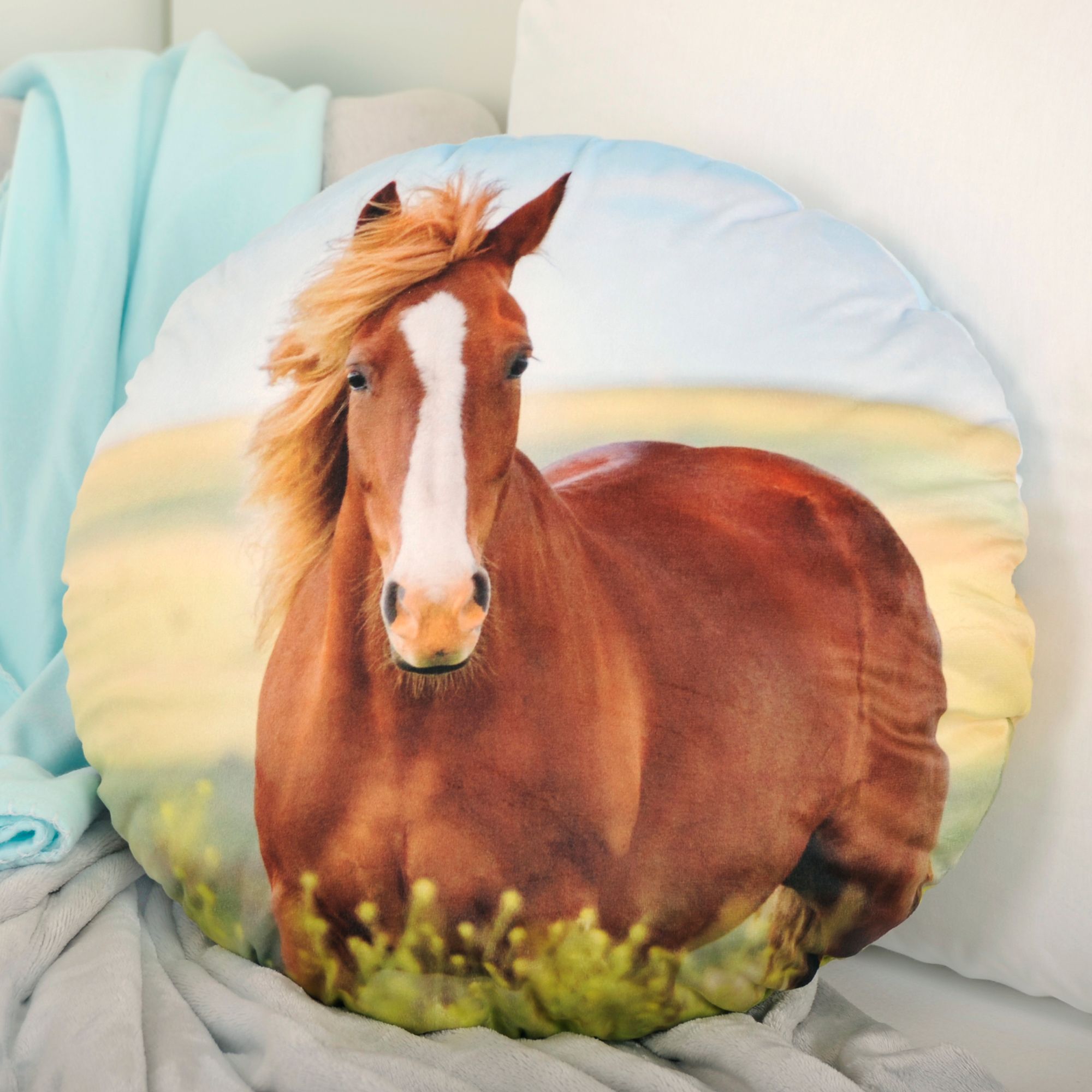 Young Collection bringt ein rundes Dekokissen aus Soft Velboa mit lebendigem Pferdemotiv in dein Zuhause. Das besonders weiche und plüschige Material lädt zum Entspannen, Lesen und Wohlfühlen ein.