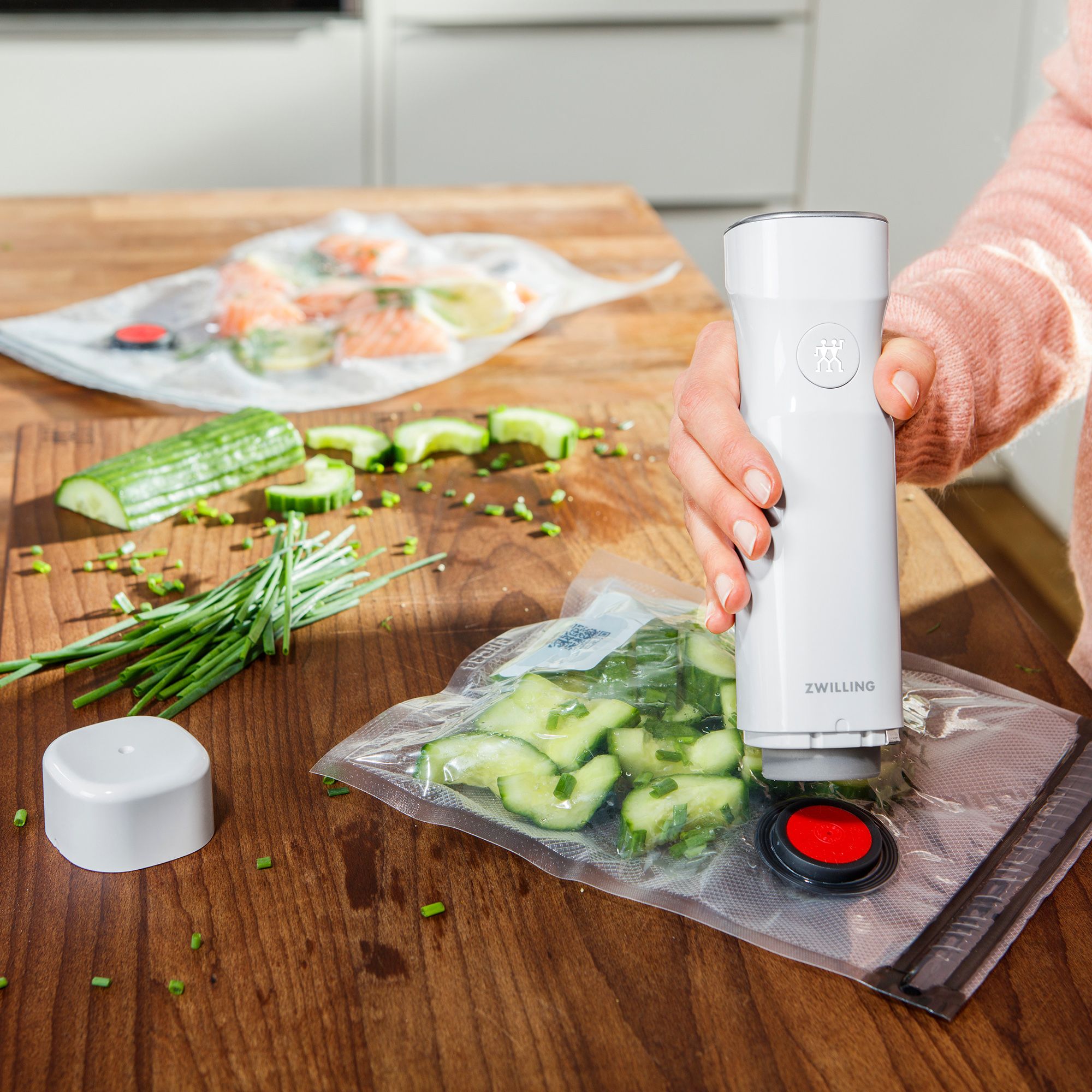 Ein Set für alle Fälle! Die Fresh & Save Starter-Kombi von ZWILLING® ist perfekt für alle, die in der Küche Wert auf hohe Qualität und kulinarische Vielfalt legen. Durchs Vakuumieren bleiben Lebensmittel bis zu fünfmal länger frisch. Kühlen, einfrieren, gratinieren, sous-vide garen, marinieren oder Meal-Prepping: Das Set macht's möglich!
