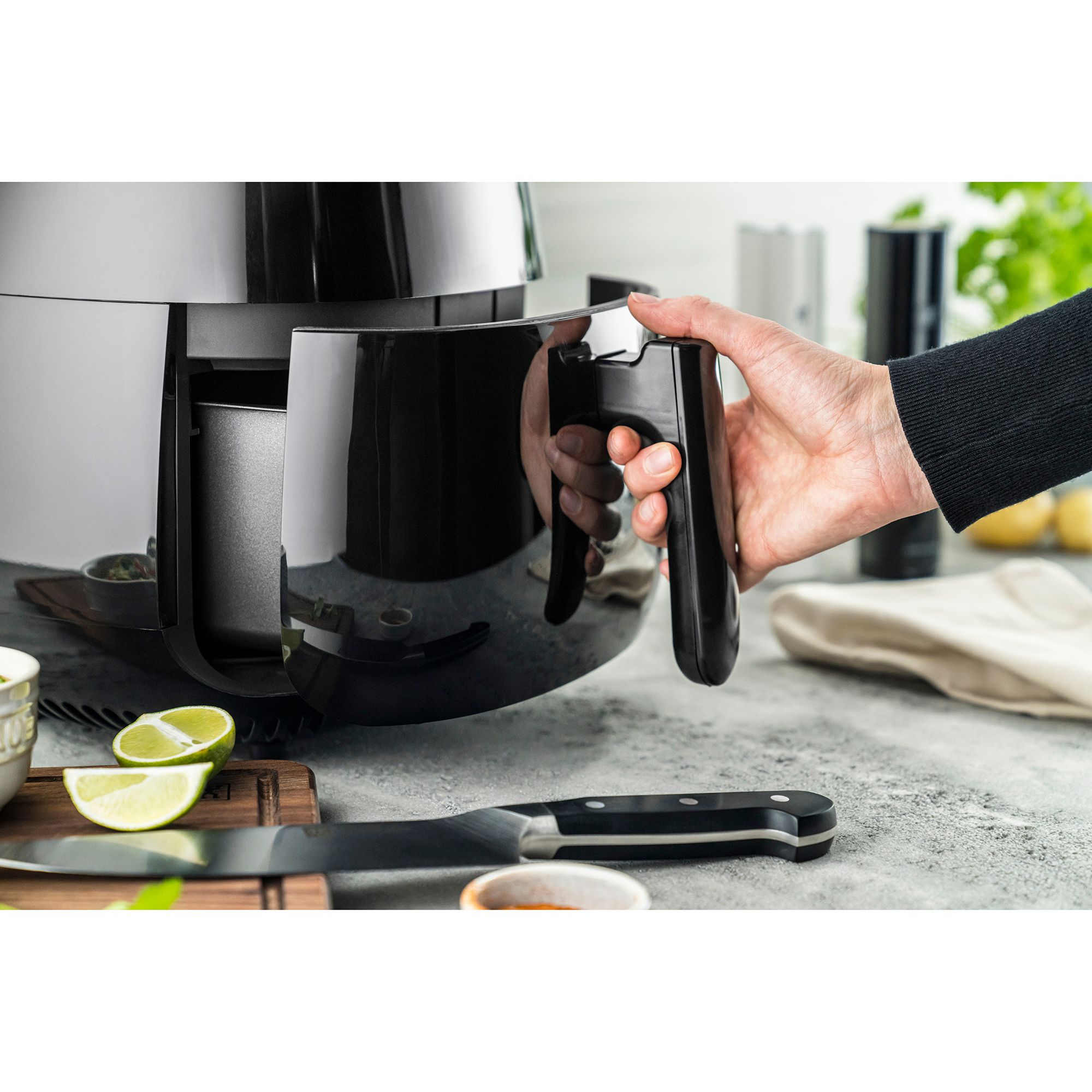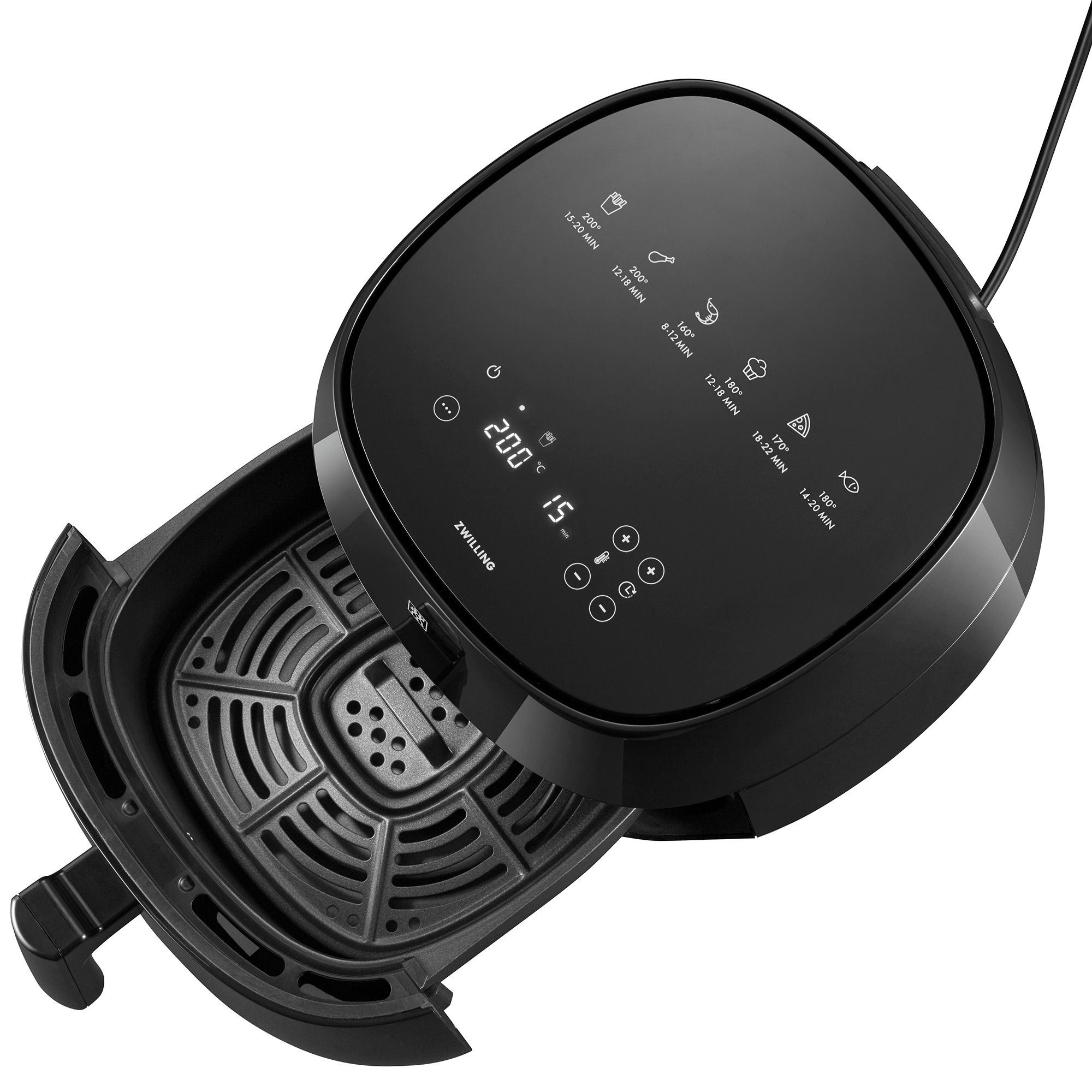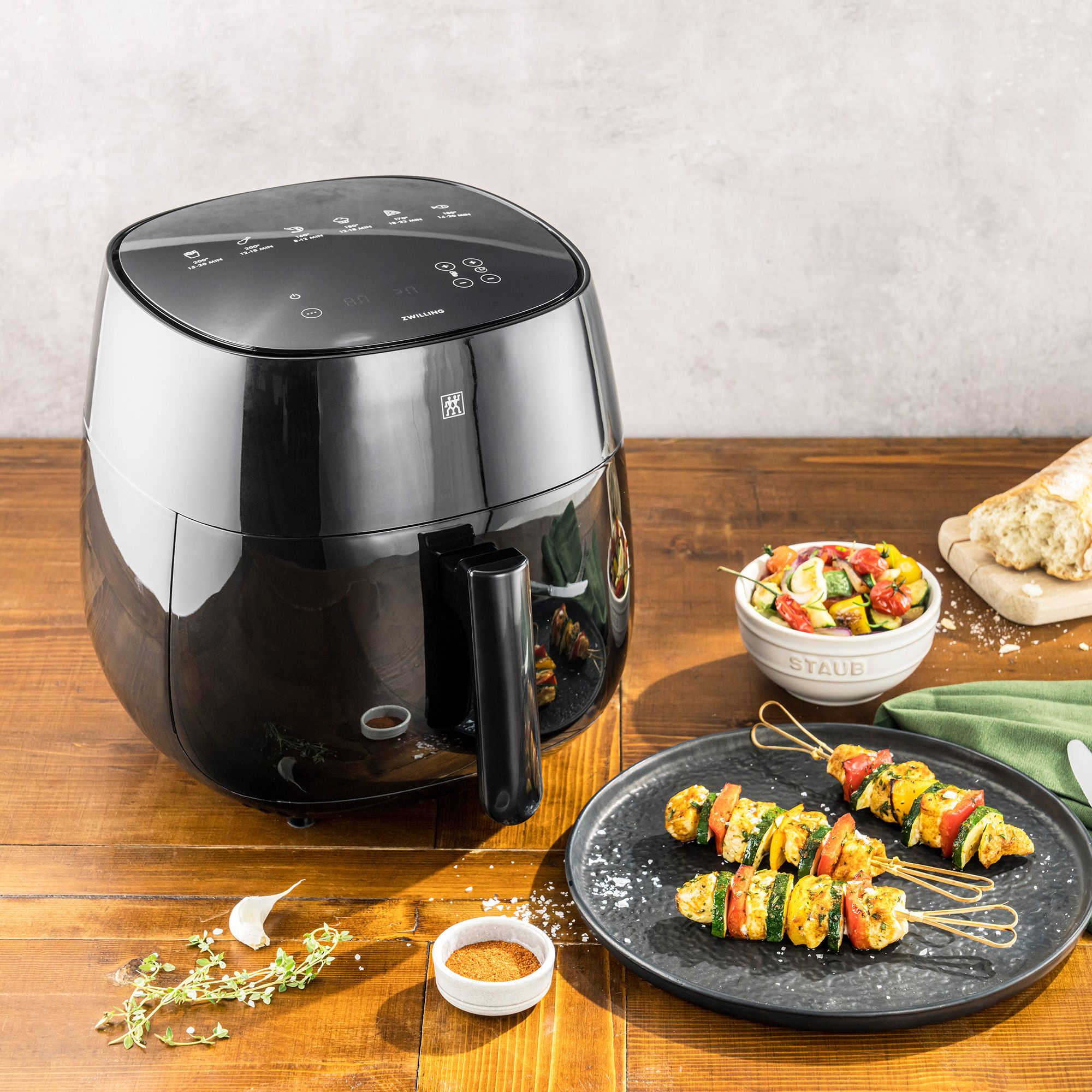 Mit der Heißluftfritteuse von ZWILLING zauberst du ganz ohne Aufwand knusprige Pommes, aromatische Chicken Wings oder saftige Pizza – und das alles mit wenig oder sogar ganz ohne Fett. Das Gerät begeistert mit sechs voreingestellten Programmen und einem modernen LED-Touch-Screen, sodass dir köstliche herzhafte und süße Gerichte im Handumdrehen gelingen. Nach dem Garen sorgt ein akustisches Signal für Sicherheit und Komfort.